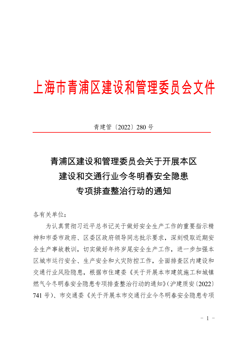 为认真贯彻习近平总书记关于做好安全生产工作的重要指示精神和市委市政府、区委区政府领导同志批示要求,深刻吸取近期安全生产事故教训,切实做好年终岁尾安全生产工作,进一步加强本区城市运行安全、生产安全和火灾防控工作,全面排查区内建设和交通行业风险隐患,根据市住建委《关于开展本市建筑施工和城镇燃气今冬明春安全隐患专项排查整治行动的通知》(沪建质安〔2022〕741号)、市交通委《关于开展本市交通行业今冬明春安全隐患专项排查整治行动工作的通知》(沪交安〔2022〕875号)、区安委会印发的《青浦区今冬明春安全隐患专项排查整治行动方案》(青安委〔2022〕7号)工作要求,结合安全生产大检查“回头看”和安全生产专项整治三年行动巩固提升工作要求,从即日起开展本区建设和交通行业今冬明春安全隐患专项排查整治行动,现就有关要求通知如下: