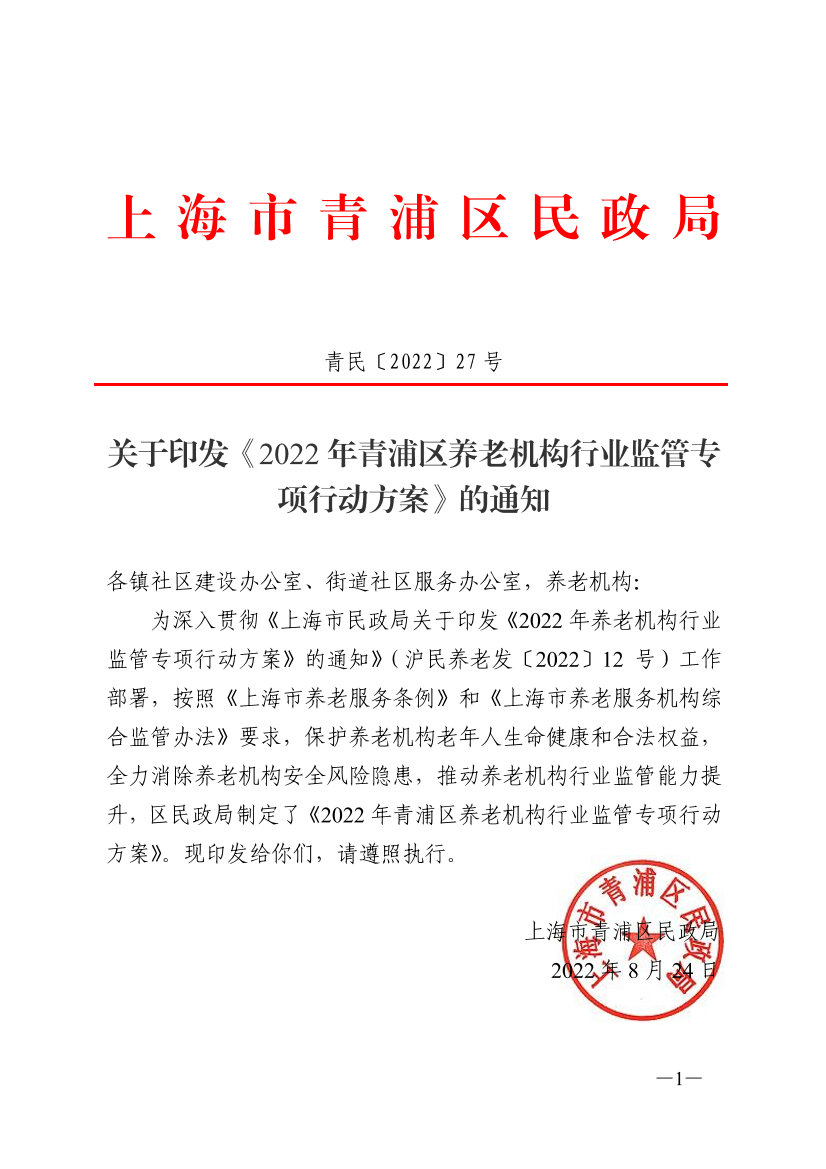 为深入贯彻《上海市民政局关于印发《2022年养老机构行业监管专项行动方案》的通知》(沪民养老发〔2022〕12号)工作部署,按照《上海市养老服务条例》和《上海市养老服务机构综合监管办法》要求,保护养老机构老年人生命健康和合法权益,全力消除养老机构安全风险隐患,推动养老机构行业监管能力提升,区民政局制定了《2022年青浦区养老机构行业监管专项行动方案》。现印发给你们,请遵照执行。