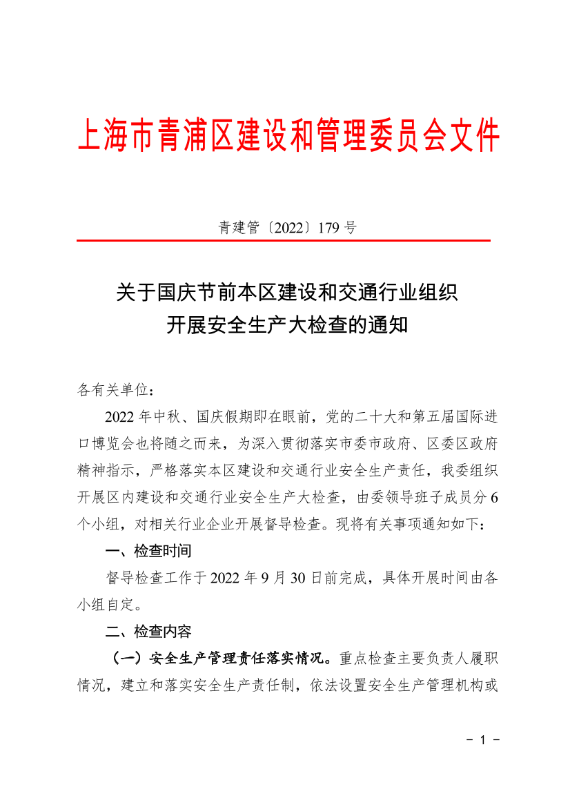 2022年中秋、国庆假期即在眼前,党的二十大和第五届国际进口博览会也将随之而来,为深入贯彻落实市委市政府、区委区政府精神指示,严格落实本区建设和交通行业安全生产责任,我委组织开展区内建设和交通行业安全生产大检查,由委领导班子成员分6个小组,对相关行业企业开展督导检查。现将有关事项通知如下: