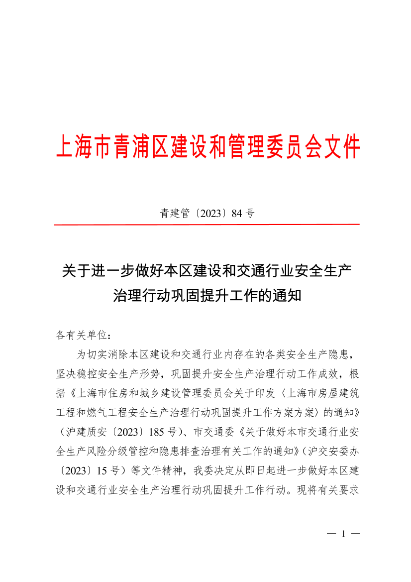 为切实消除本区建设和交通行业内存在的各类安全生产隐患,坚决稳控安全生产形势,巩固提升安全生产治理行动工作成效,根据《上海市住房和城乡建设管理委员会关于印发〈上海市房屋建筑工程和燃气工程安全生产治理行动巩固提升工作方案方案〉的通知》(沪建质安〔2023〕185号)、市交通委《关于做好本市交通行业安全生产风险分级管控和隐患排查治理有关工作的通知》(沪交安委办〔2023〕15号)等文件精神,我委决定从即日起进一步做好本区建设和交通行业安全生产治理行动巩固提升工作行动。现将有关要求通知如下: