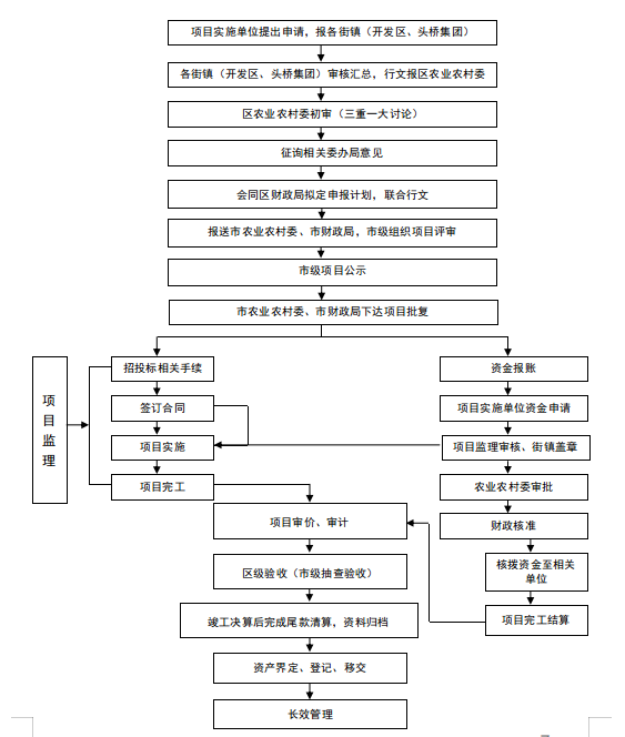 在市级下达计划批复后,区农业农村委召开项目启动会,布置计划任务,明确项目要求,开展预算计划安排、资金审核拨付、项目调整批复、竣工验收决算及全过程监督指导等相关工作。各街镇、开发区及头桥集团做好日常管理指导工作,推动项目正常实施。项目实施单位作为项目法人,按照相关要求,组织开展项目建设。