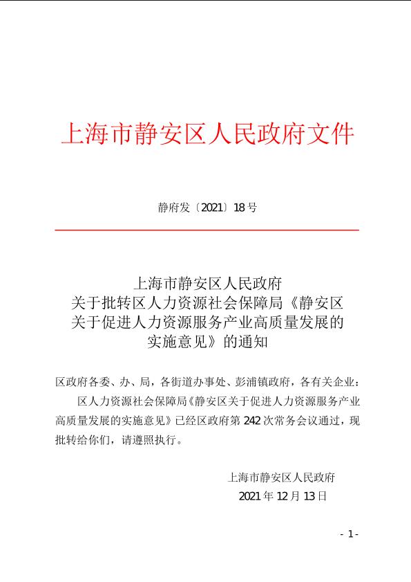静安区关于促进人力资源服务产业高质量发展的实施意见
