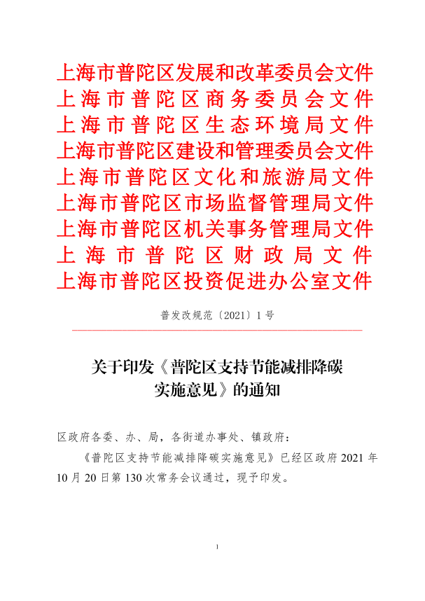 《普陀区支持节能减排降碳实施意见》已经区政府2021年10月20日第130次常务会议通过,现予印发。
