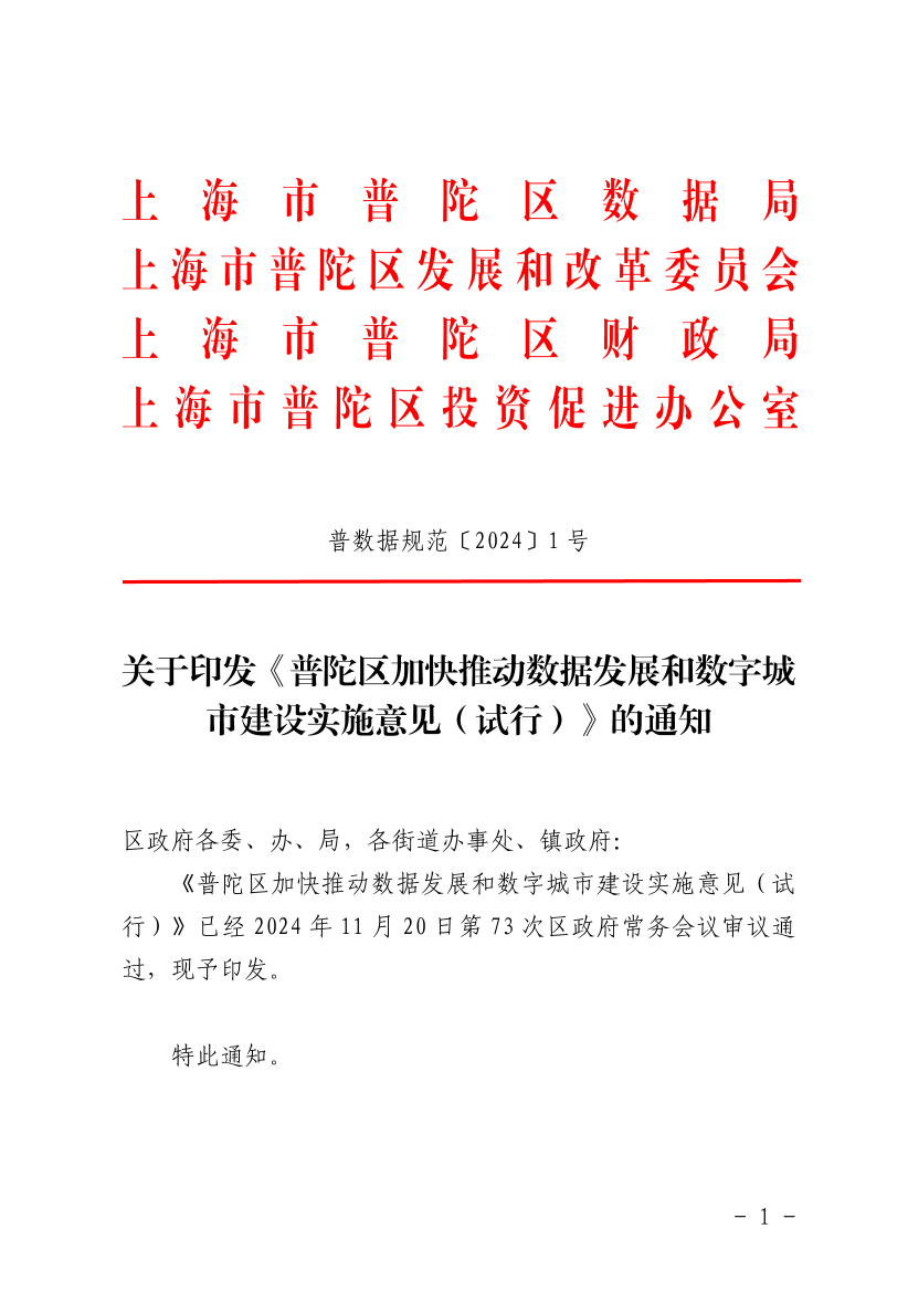 《普陀区加快推动数据发展和数字城市建设实施意见(试行)》已经2024年11月20日第73次区政府常务会议审议通过,现予印发。