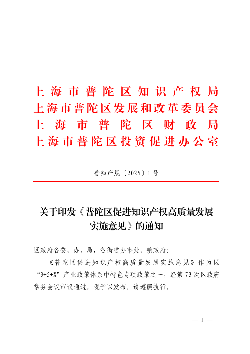 《普陀区促进知识产权高质量发展实施意见》作为区“3+5+X”产业政策体系中特色专项政策之一,经第73次区政府常务会议审议通过,现予以发布,请遵照执行。