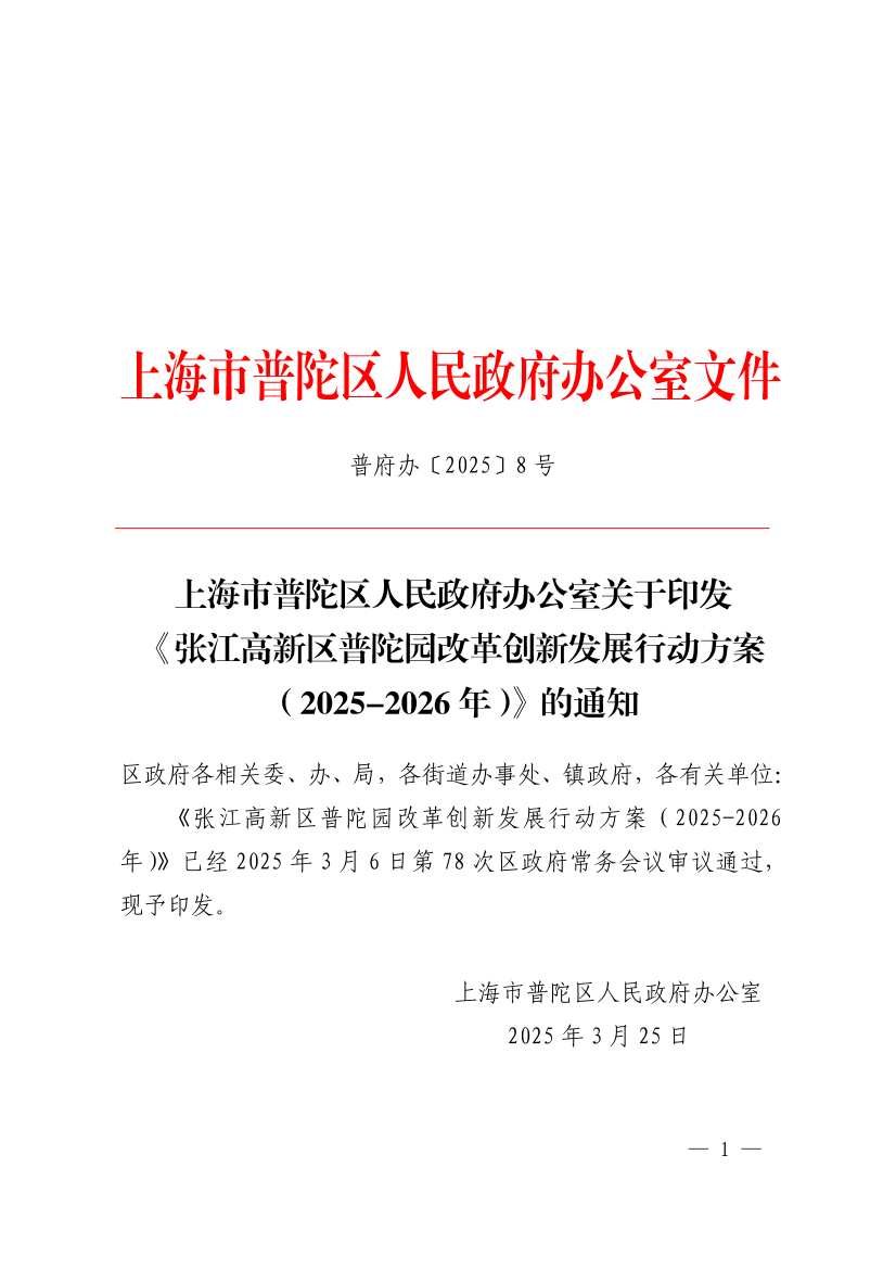 《张江高新区普陀园改革创新发展行动方案(2025-2026年)》已经2025年3月6日第78次区政府常务会议审议通过,现予印发。