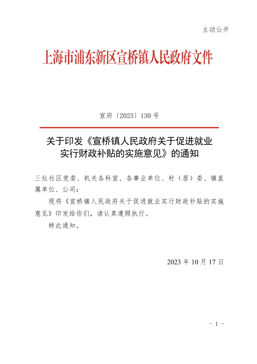 关于印发《宣桥镇人民政府关于促进就业实行财政补贴的实施意见》的通知