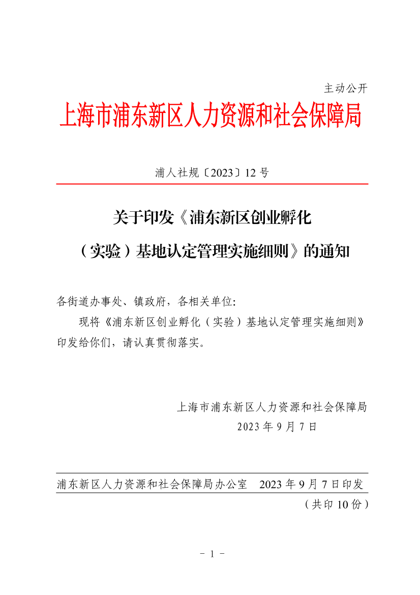 关于印发《浦东新区创业孵化(实验)基地认定管理实施细则》的通知