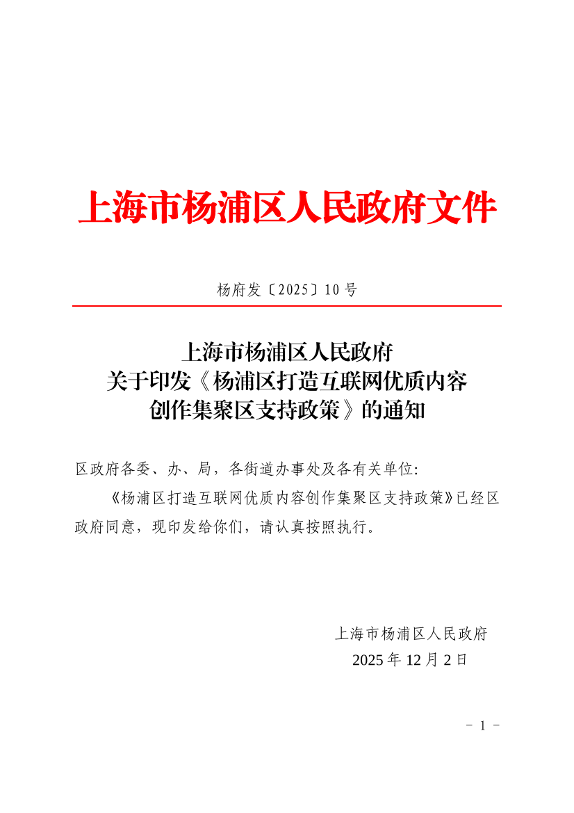 《杨浦区打造互联网优质内容创作集聚区支持政策》已经区政府同意,现印发给你们,请认真按照执行。