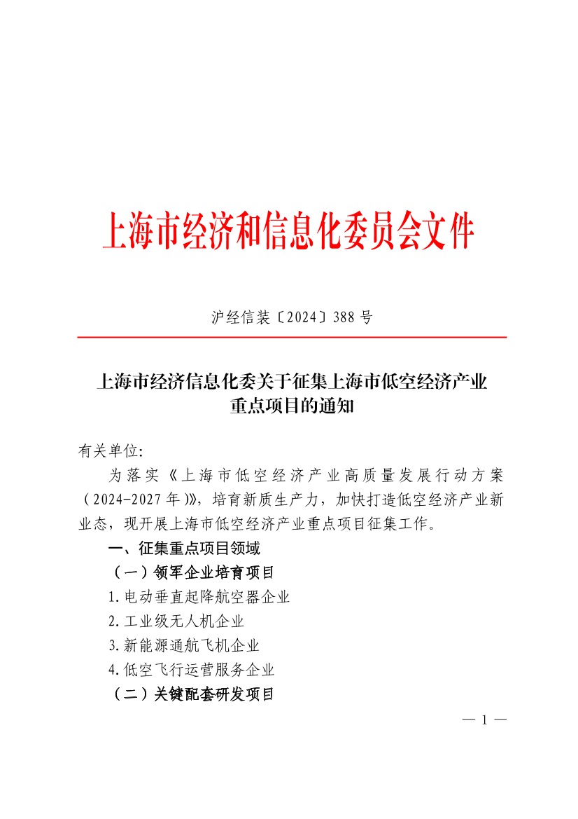 为落实《上海市低空经济产业高质量发展行动方案(2024-2027年)》,培育新质生产力,加快打造低空经济产业新业态,现开展上海市低空经济产业重点项目征集工作。