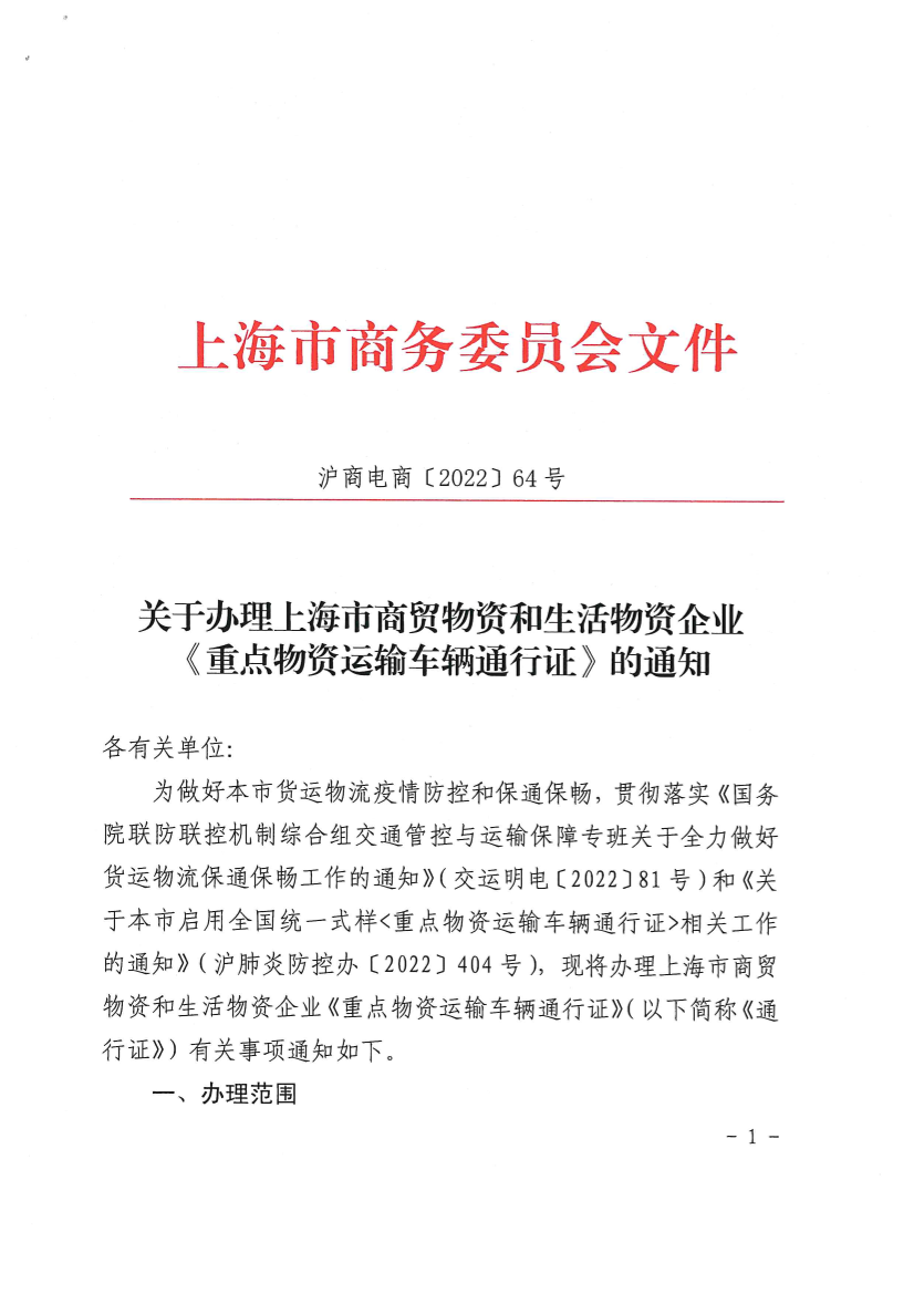 为做好本市货运物流疫情防控和保通保畅,贯彻落实《国务院联防联控机制综合组交通管控与运输保障专班关于全力做好货运物流保通保畅工作的通知》(交运明电〔2022〕81号)和《关于本市启用全国统一式样<重点物资运输车辆通行证>相关工作的通知》(沪肺炎防控办〔2022〕404号),现将办理上海市商贸物资和生活物资企业《重点物资运输车辆通行证》(以下简称《通行证》)有关事项通知如下。