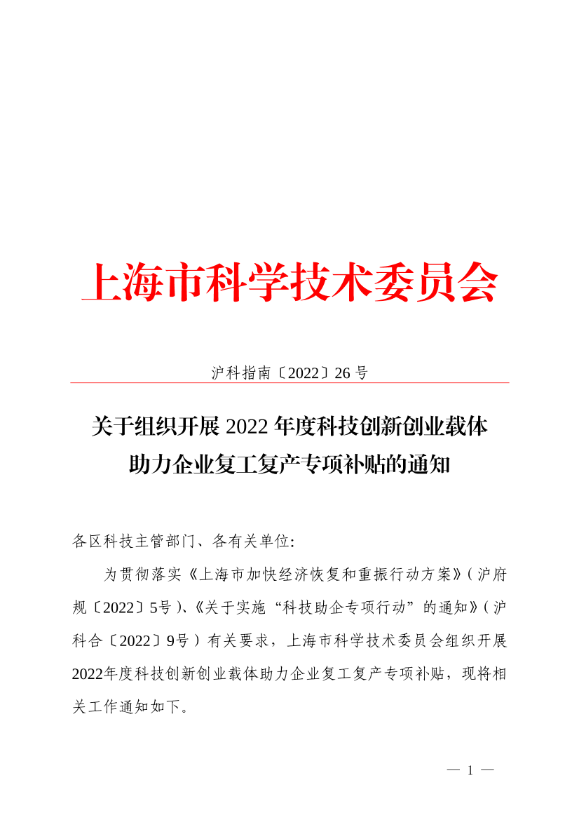 为贯彻落实《上海市加快经济恢复和重振行动方案》(沪府规〔2022〕5号)、《关于实施“科技助企专项行动”的通知》(沪科合〔2022〕9号)有关要求,上海市科学技术委员会组织开展2022年度科技创新创业载体助力企业复工复产专项补贴,现将相关工作通知如下。