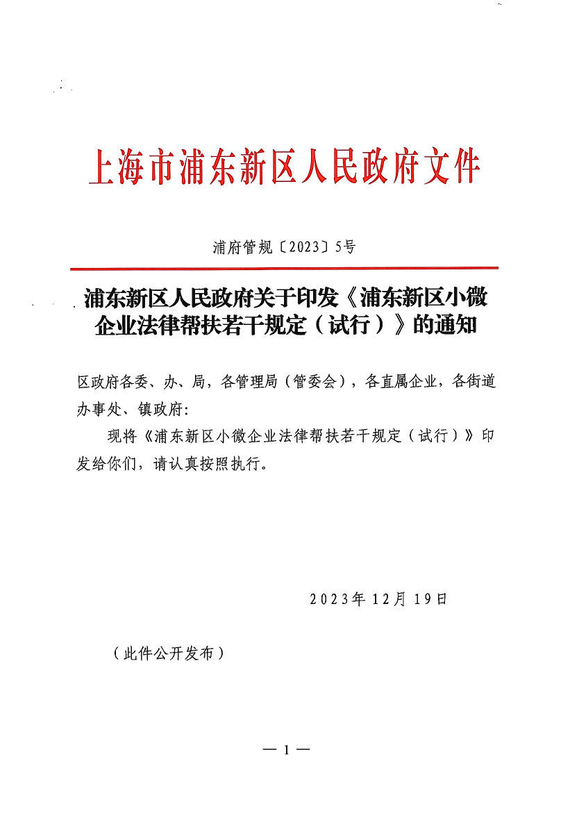 浦东新区人民政府关于印发《浦东新区小微企业法律帮扶若干规定(试行)》的通知