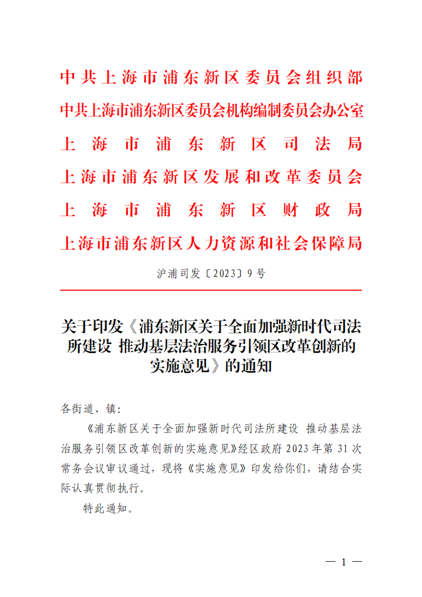 《浦东新区关于全面加强新时代司法所建设 推动基层法治服务引领区改革创新的实施意见》经区政府2023年第31次常务会议审议通过,现将《实施意见》印发给你们,请结合实际认真贯彻执行。