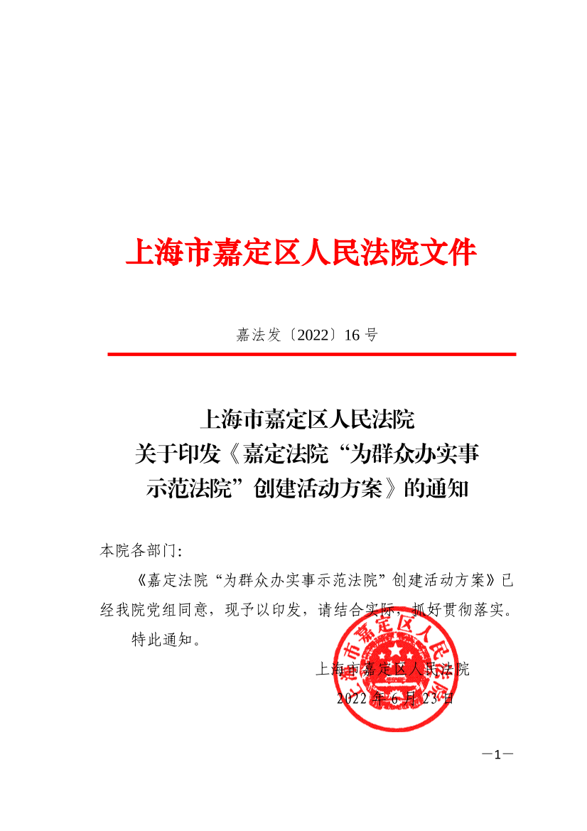 上海市嘉定区人民法院关于印发《嘉定法院“为群众办实事示范法院”创建活动方案》的通知