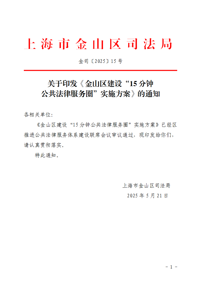 《金山区建设“15分钟公共法律服务圈”实施方案》已经区推进公共法律服务体系建设联席会议审议通过,现印发给你们,请认真贯彻落实。