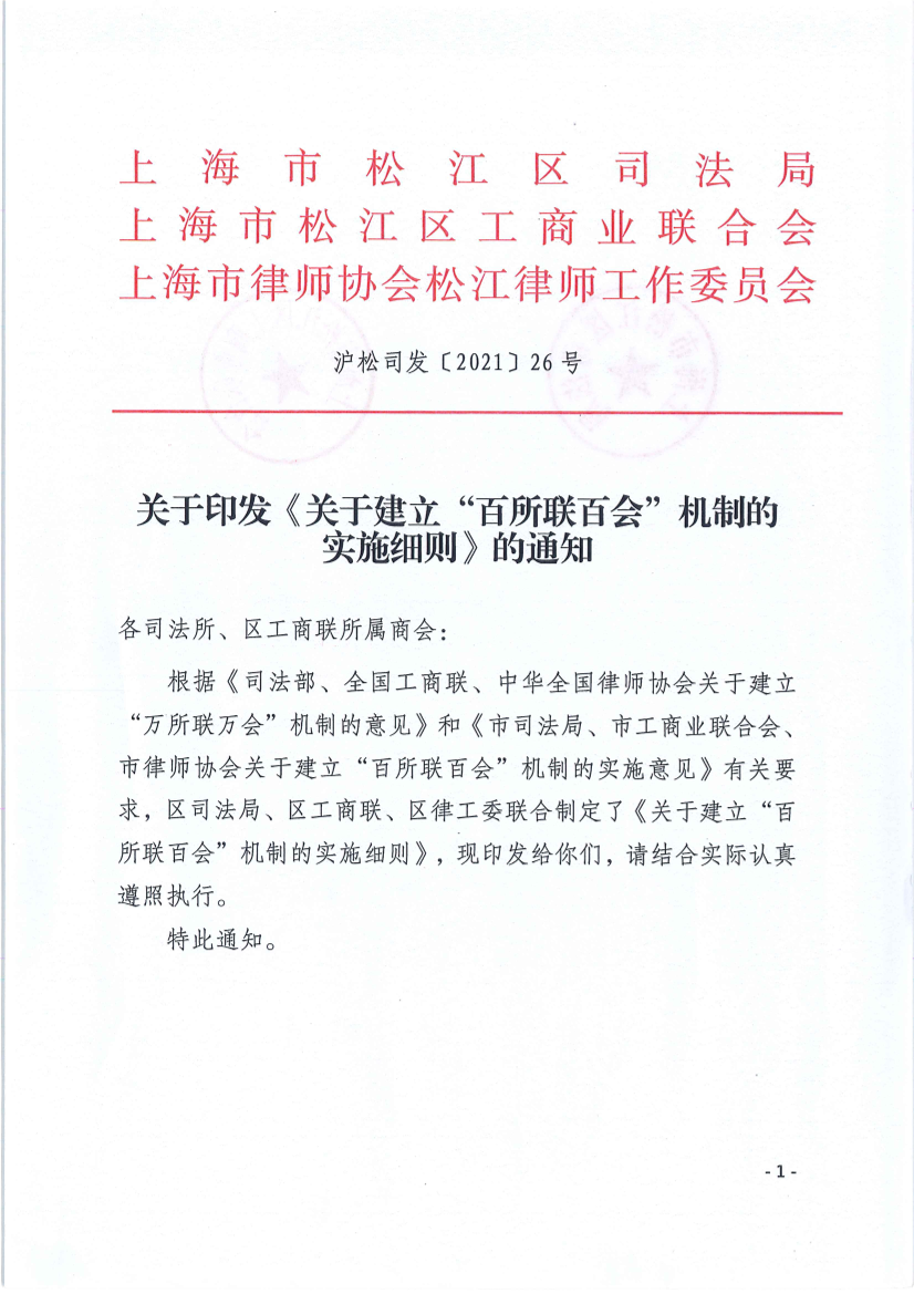 根据《司法部、全国工商联、中华全国律师协会关于建立 “万所联万会”机制的意见》和《市司法局、市工商业联合会、市律师协会关于建立“百所联百会”机制的实施意见》有关要求,区司法局、区工商联、区律工委联合制定了《关于建立“百所联百会”机制的实施细则》,现印发给你们,请结合实际认真遵照执行。