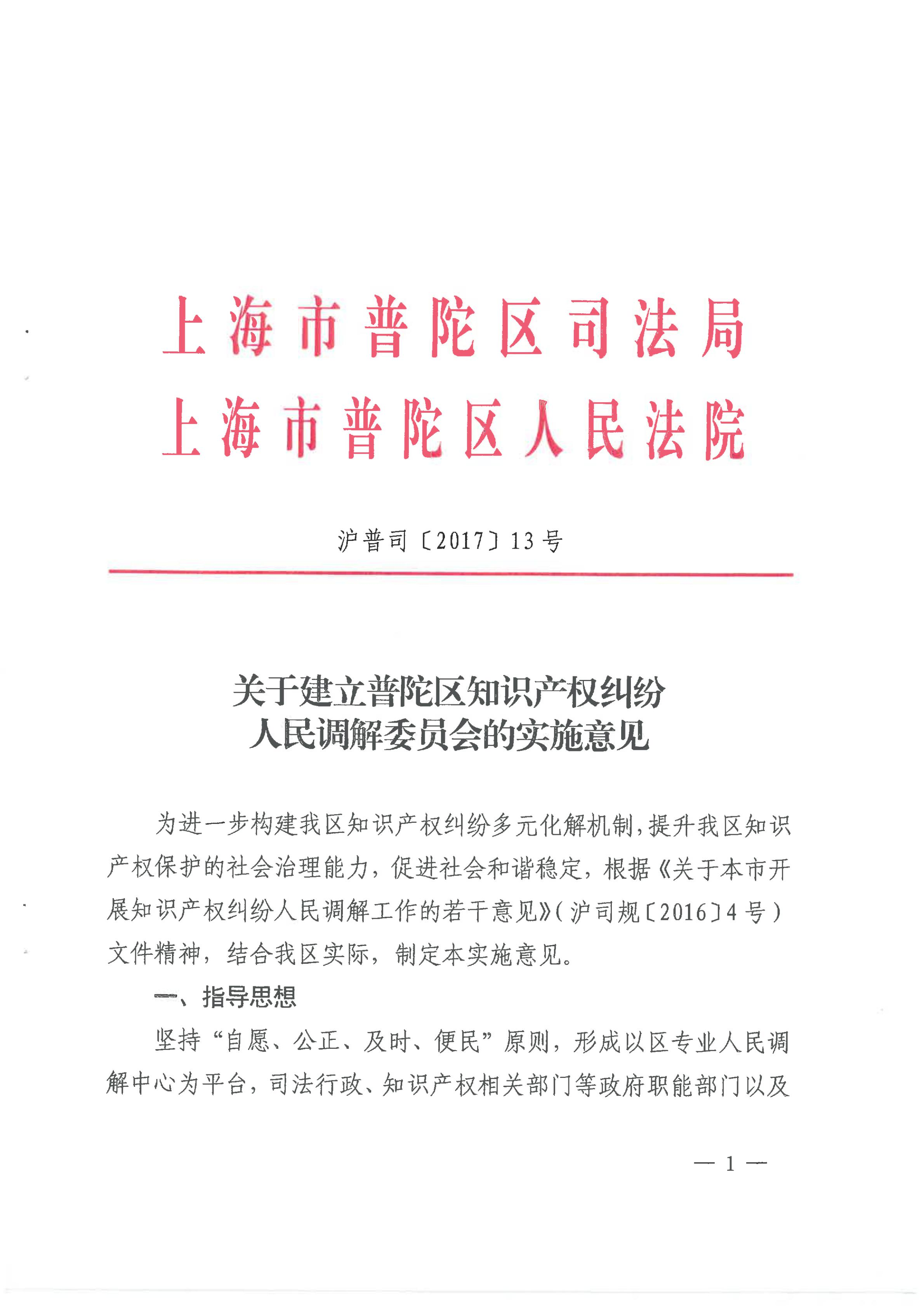 关于建立普陀区知识产权纠纷人民调解委员会的实施意见