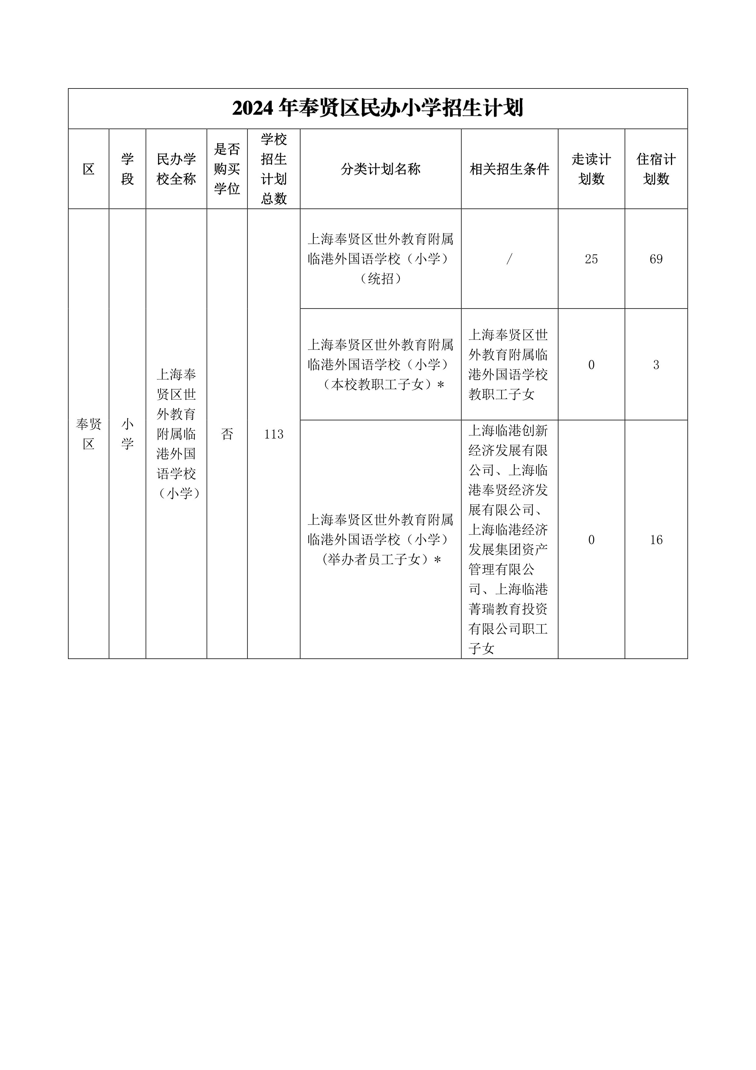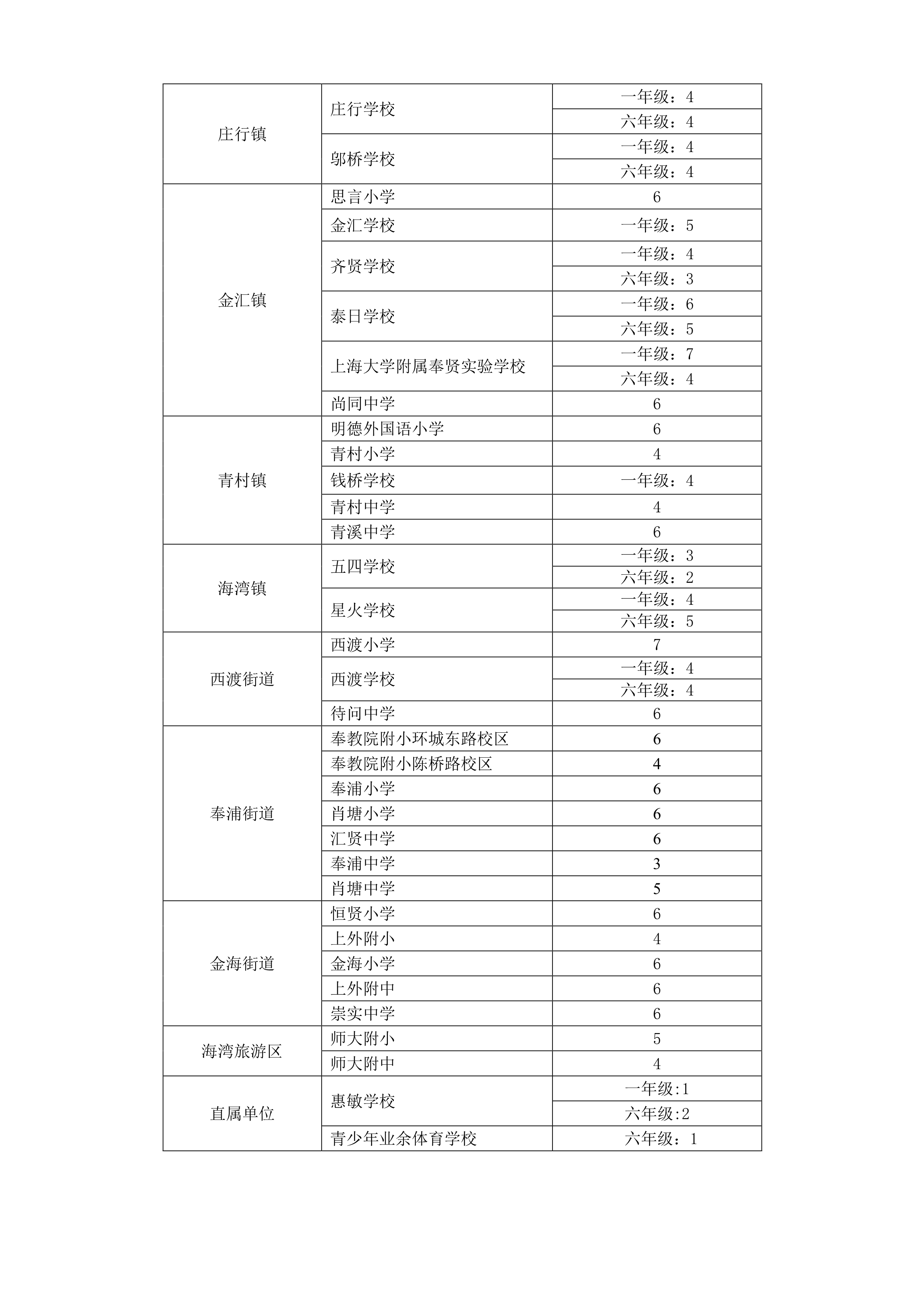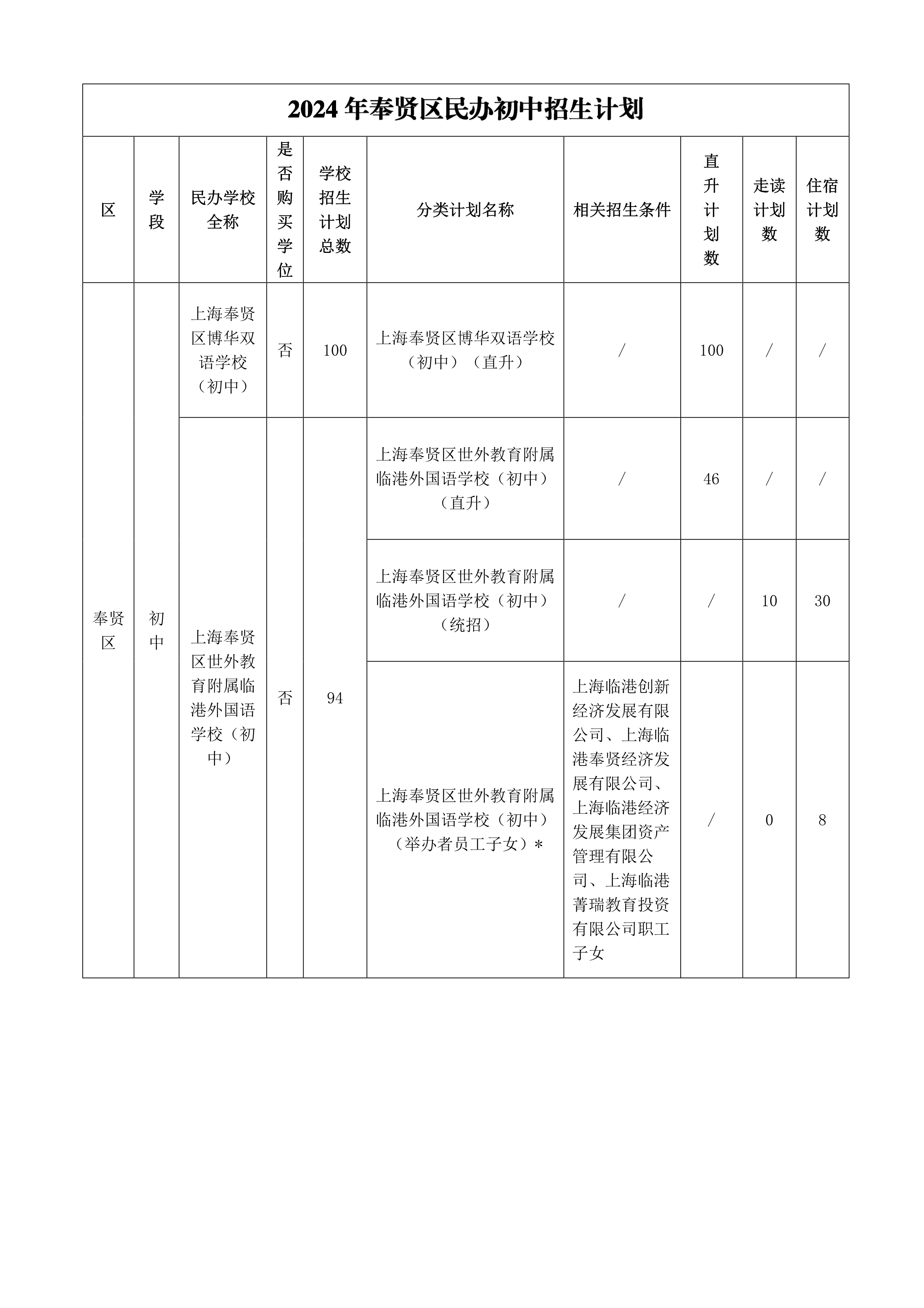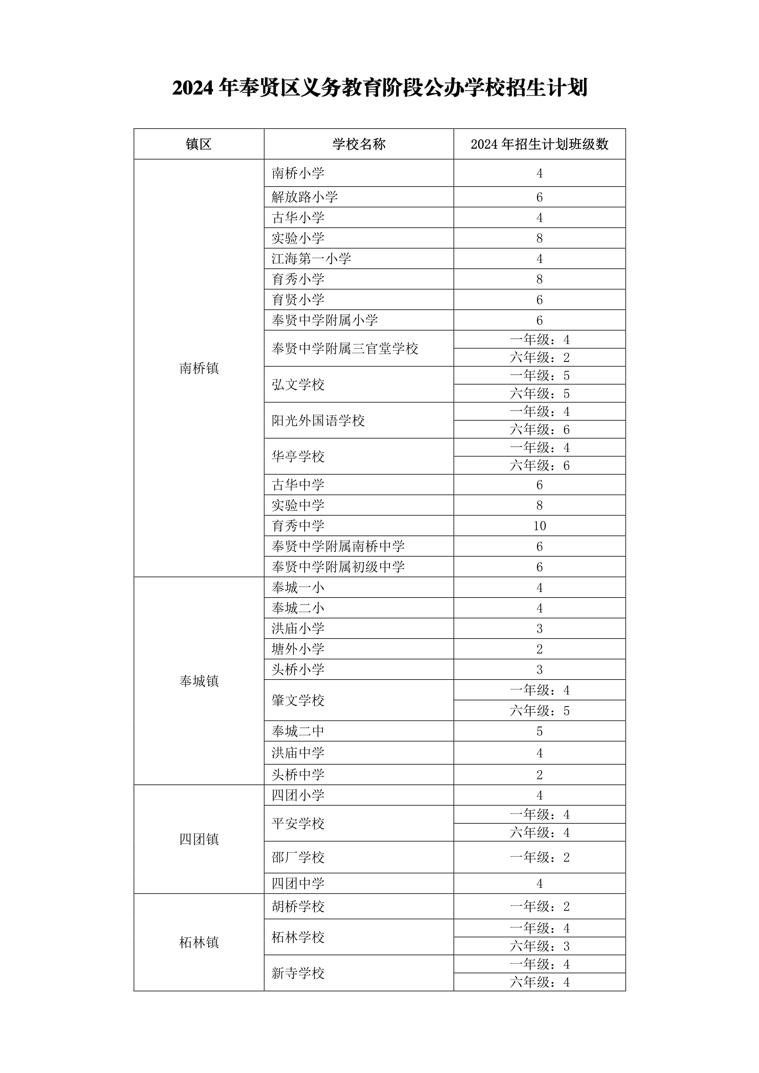 2024年奉贤区义务教育阶段公民办学校招生计划