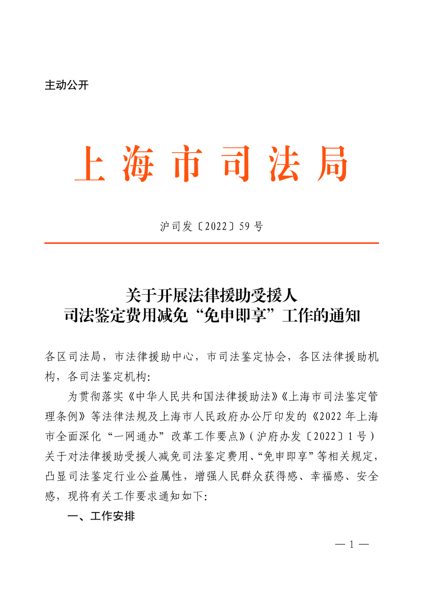 为贯彻落实《中华人民共和国法律援助法》《上海市司法鉴定管理条例》等法律法规及上海市人民政府办公厅印发的《2022年上海市全面深化“一网通办”改革工作要点》(沪府办发〔2022〕1号)关于对法律援助受援人减免司法鉴定费用、“免申即享”等相关规定,凸显司法鉴定行业公益属性,增强人民群众获得感、幸福感、安全感,现将有关工作要求通知如下: