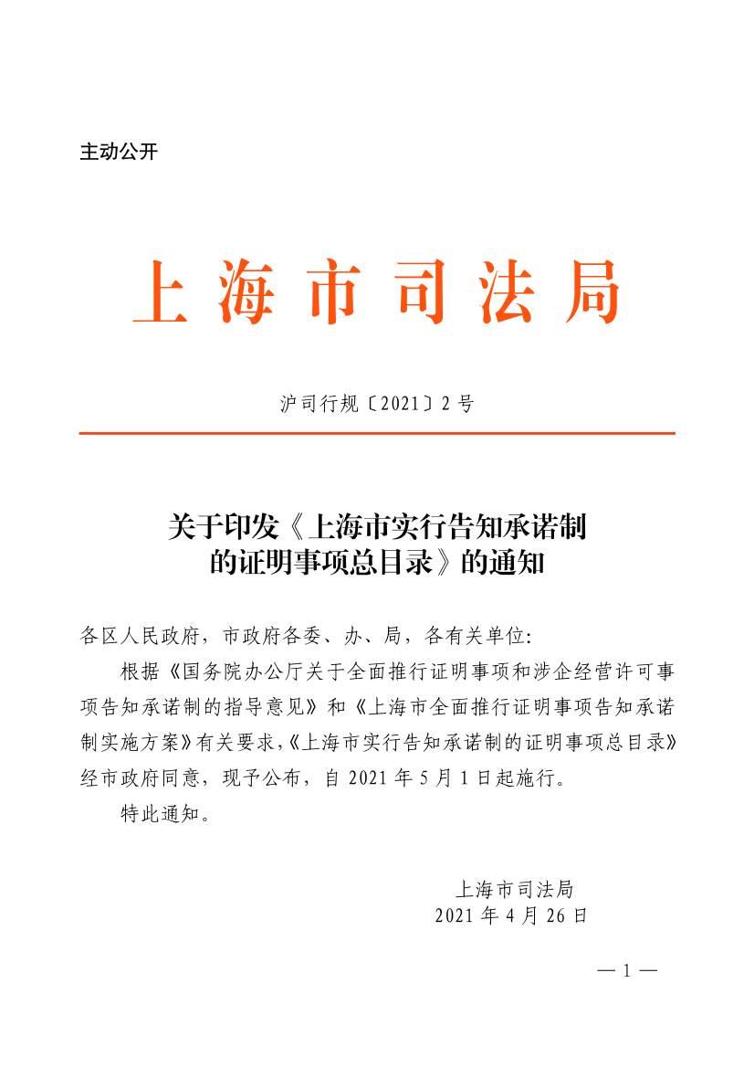 根据《国务院办公厅关于全面推行证明事项和涉企经营许可事项告知承诺制的指导意见》和《上海市全面推行证明事项告知承诺制实施方案》有关要求,《上海市实行告知承诺制的证明事项总目录》经市政府同意,现予公布,自2021年5月1日起施行。