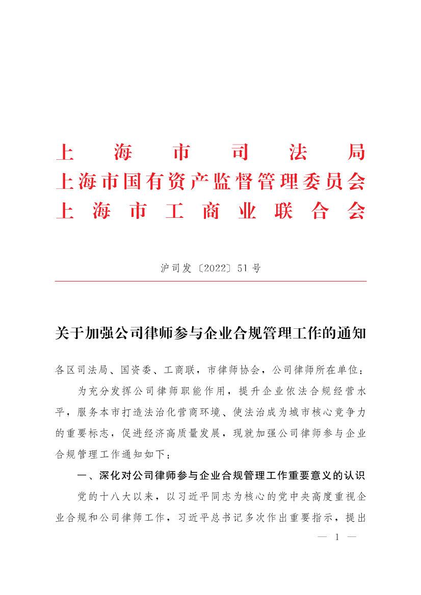 为充分发挥公司律师职能作用,提升企业依法合规经营水平,服务本市打造法治化营商环境、使法治成为城市核心竞争力的重要标志,促进经济高质量发展,现就加强公司律师参与企业合规管理工作通知如下: