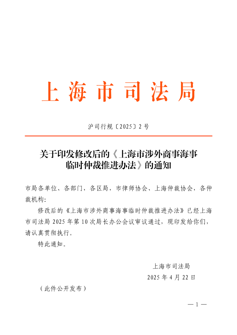 修改后的《上海市涉外商事海事临时仲裁推进办法》已经上海市司法局2025年第10次局长办公会议审议通过,现印发给你们,请认真贯彻执行。
