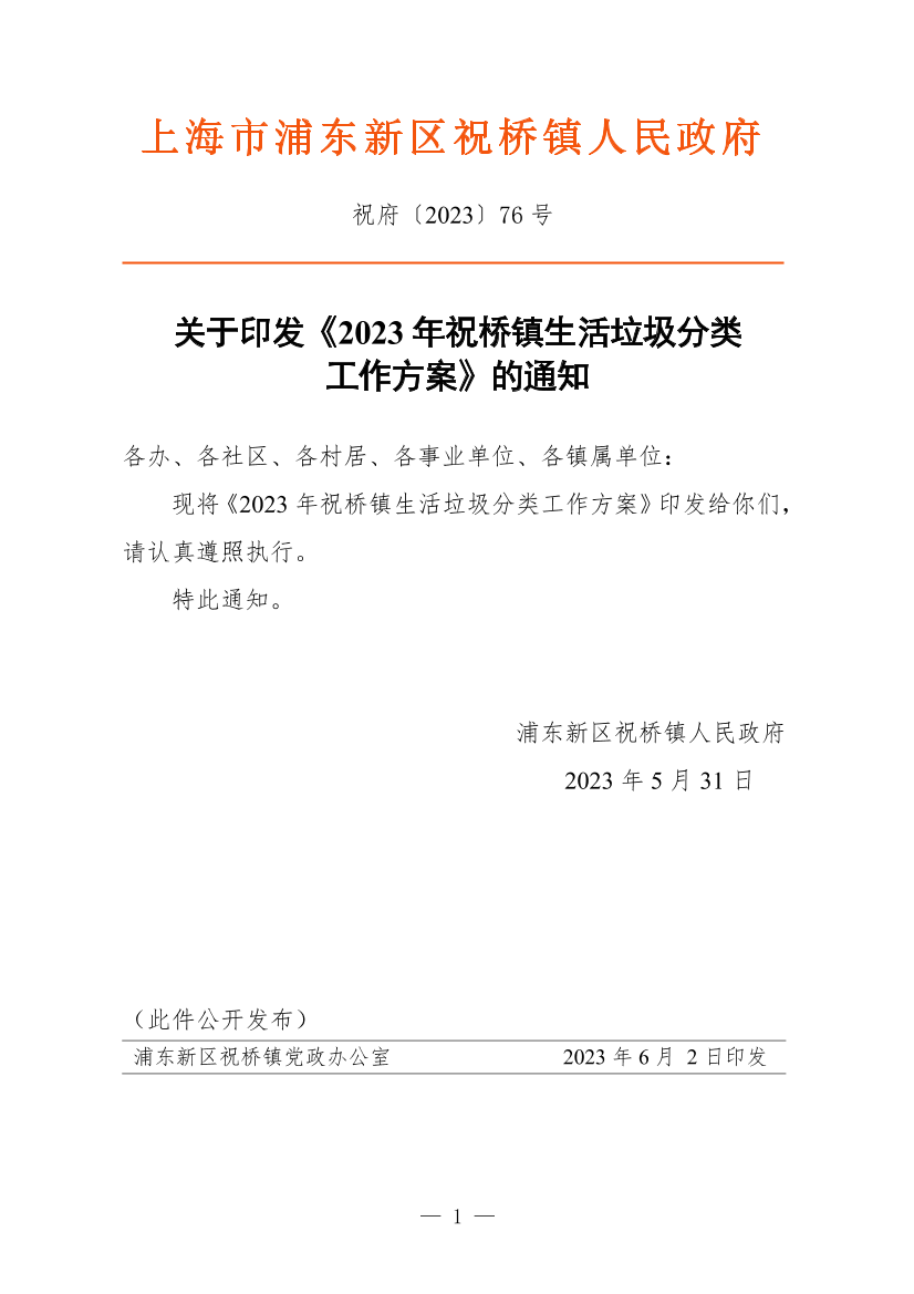 关于印发《2023年祝桥镇生活垃圾分类工作方案》的通知