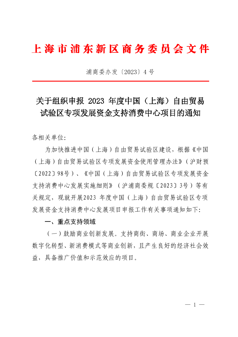 为加快推进中国(上海)自由贸易试验区建设,根据《中国 (上海)自由贸易试验区专项发展资金使用管理办法》(沪财预 〔2022〕98号)、《中国(上海)自由贸易试验区专项发展资金支持消费中心发展实施细则》(沪浦商委规〔2023〕3号)等有关规定,现就开展2023 年度中国(上海)自由贸易试验区专项发展资金支持消费中心发展项目申报工作有关事项通知如下: