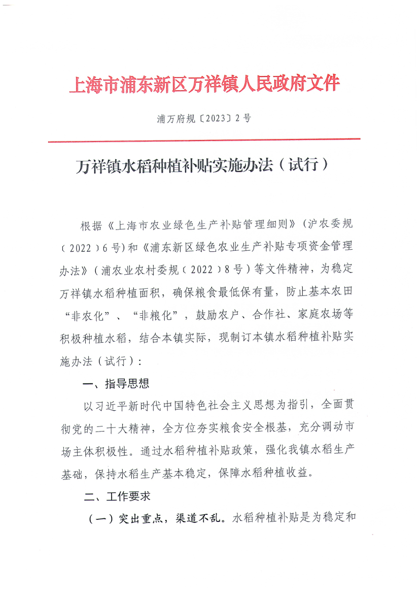 根据《上海市农业绿色生产补贴管理细则》(沪农委规﹝2022﹞6号)和《浦东新区绿色农业生产补贴专项资金管理办法》(浦农业农村委规﹝2022﹞8号)等文件精神,为稳定万祥镇水稻种植面积,确保粮食最低保有量,防止基本农田“非农化”、“非粮化”,鼓励农户、合作社、家庭农场等积极种植水稻,结合本镇实际,现制订本镇水稻种植补贴实施办法(试行):