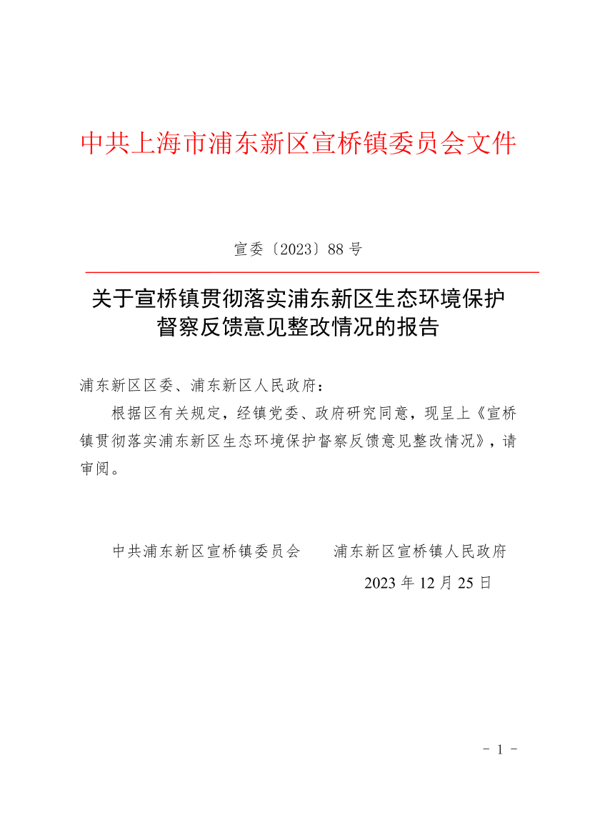 根据区有关规定,经镇党委、政府研究同意,现呈上《宣桥镇贯彻落实浦东新区生态环境保护督察反馈意见整改情况》,请审阅。