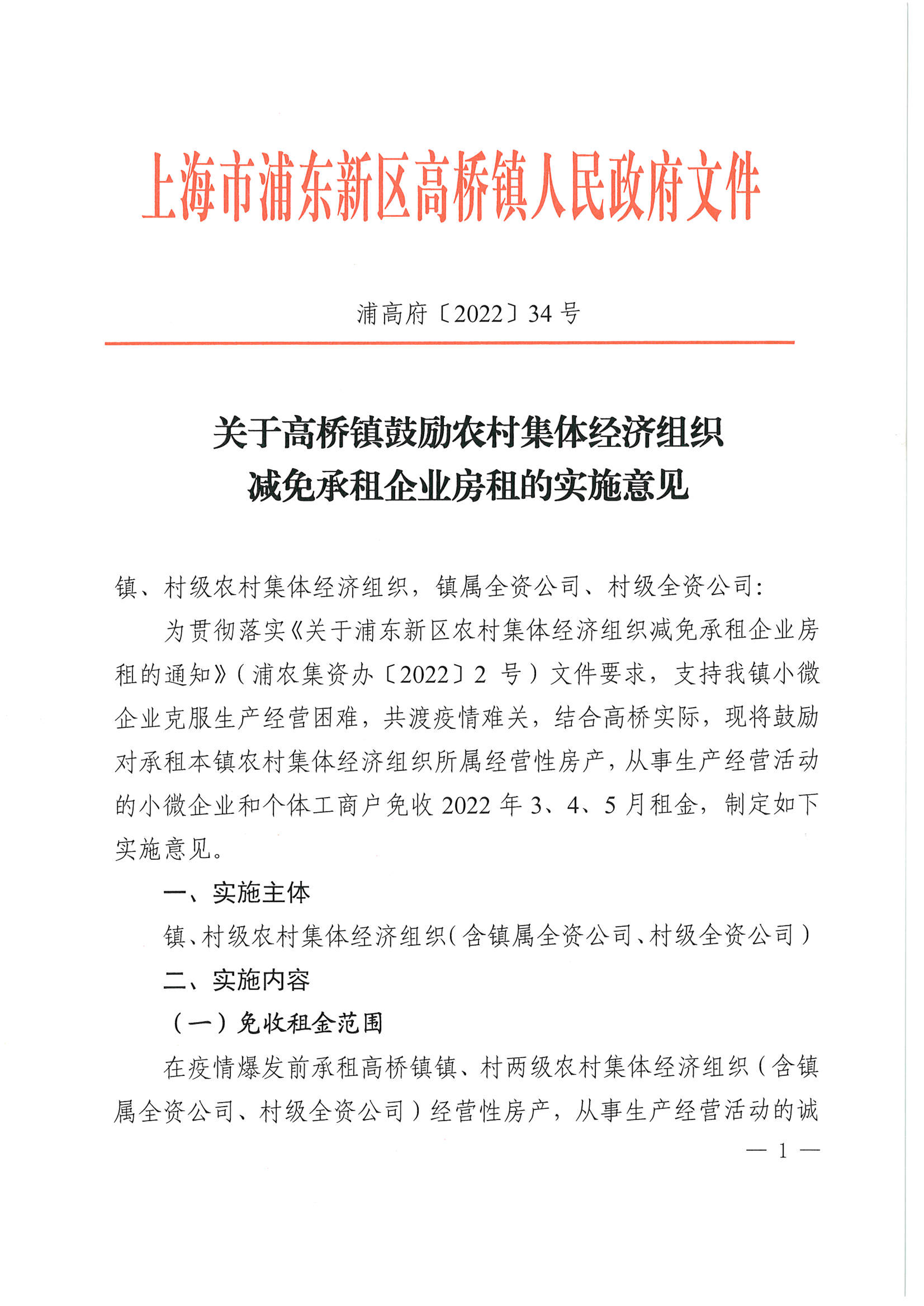 为贯彻落实《关于浦东新区农村集体经济组织减免承租企业房租的通知》(浦农集资办〔 2022 〕 2 号)文件要求,支持我镇小微企业克服生产经营困难,共渡疫情难关,结合高桥实际,现将鼓励对承租本镇农村集体经济组织所属经营性房产,从事生产经营活动的小微企业和个体工商户免收 2022 年 3 、 4 、 5 月租金,制定如下实施意见。