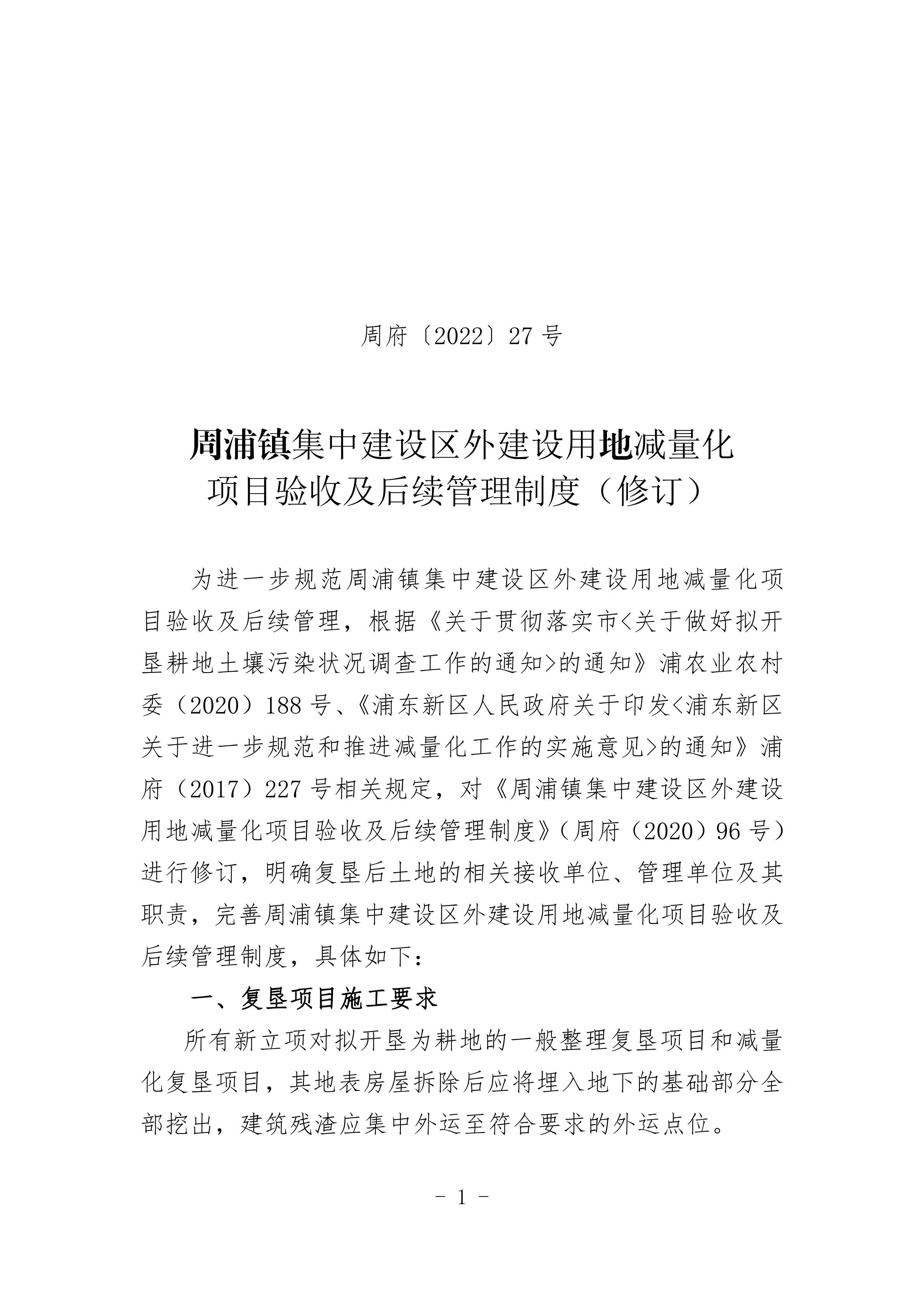 为进一步规范周浦镇集中建设区外建设用地减量化项目验收及后续管理,根据《关于贯彻落实市<关于做好拟开垦耕地土壤污染状况调查工作的通知>的通知》浦农业农村委(2020)188号、《浦东新区人民政府关于印发<浦东新区关于进一步规范和推进减量化工作的实施意见>的通知》浦府(2017)227号相关规定,对《周浦镇集中建设区外建设用地减量化项目验收及后续管理制度》(周府(2020)96号)进行修订,明确复垦后土地的相关接收单位、管理单位及其职责,完善周浦镇集中建设区外建设用地减量化项目验收及后续管理制度,具体如下: