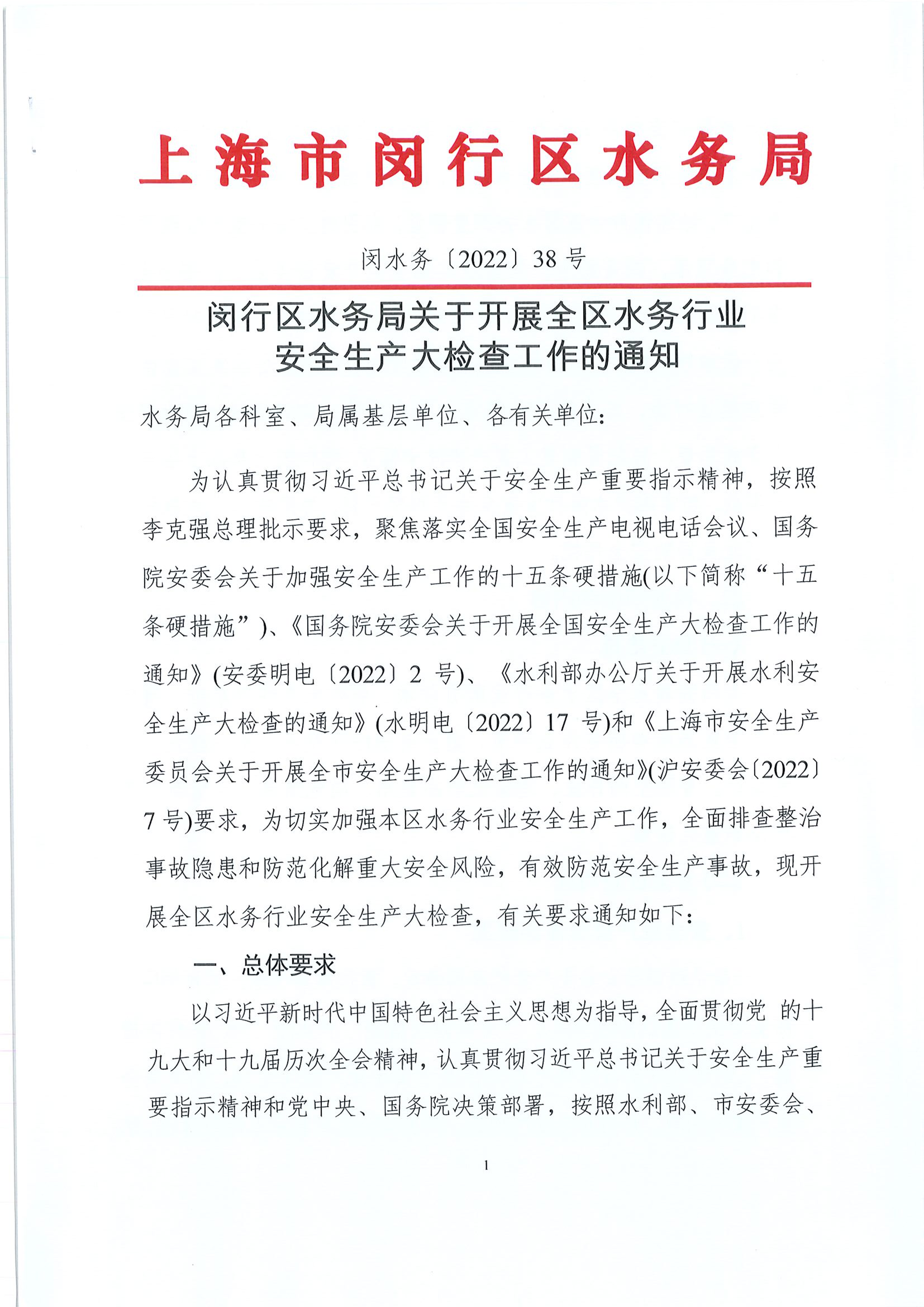 为认真贯彻习近平总书记关于安全生产重要指示精神,按照 李克强总理批示要求,聚焦落实全国安全生产电视电话会议、国务院安委会关于加强安全生产工作的十五条硬措施(以下简称“十五条硬措施”)、《国务院安委会关于开展全国安全生产大检查工作的通知》(安委明电〔2022〕2 号)、《水利部办公厅关于开展水利安全生产大检查的通知》(水明电〔2022〕17 号)和《上海市安全生产委员会关于开展全市安全生产大检查工作的通知》(沪安委会〔2022〕7号)要求,为切实加强本区水务行业安全生产工作,全面排查整治事故隐患和防范化解重大安全风险,有效防范安全生产事故,现开展全区水务行业安全生产大检查,有关要求通知如下: