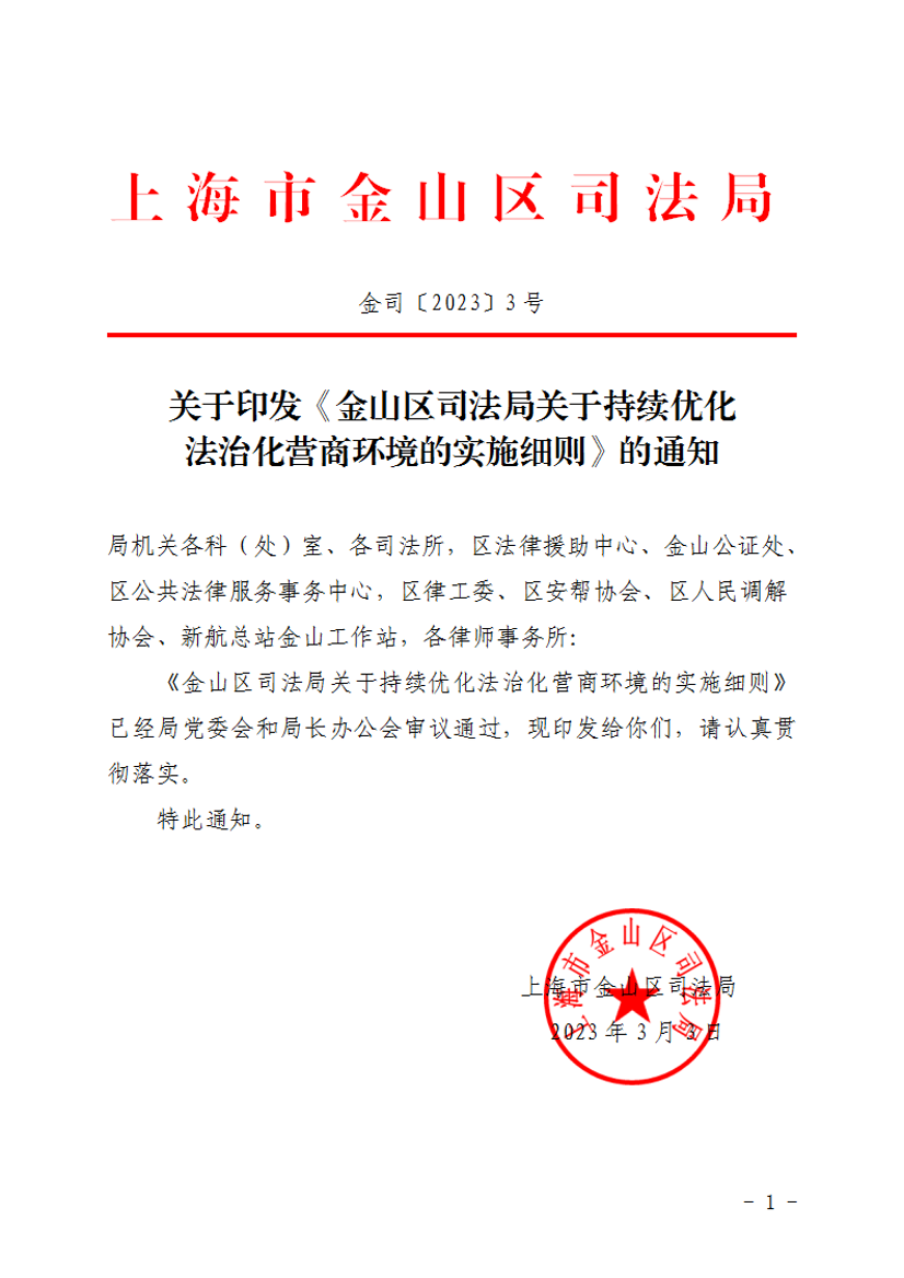 《金山区司法局关于持续优化法治化营商环境的实施细则》已经局党委会和局长办公会审议通过,现印发给你们,请认真贯彻落实。