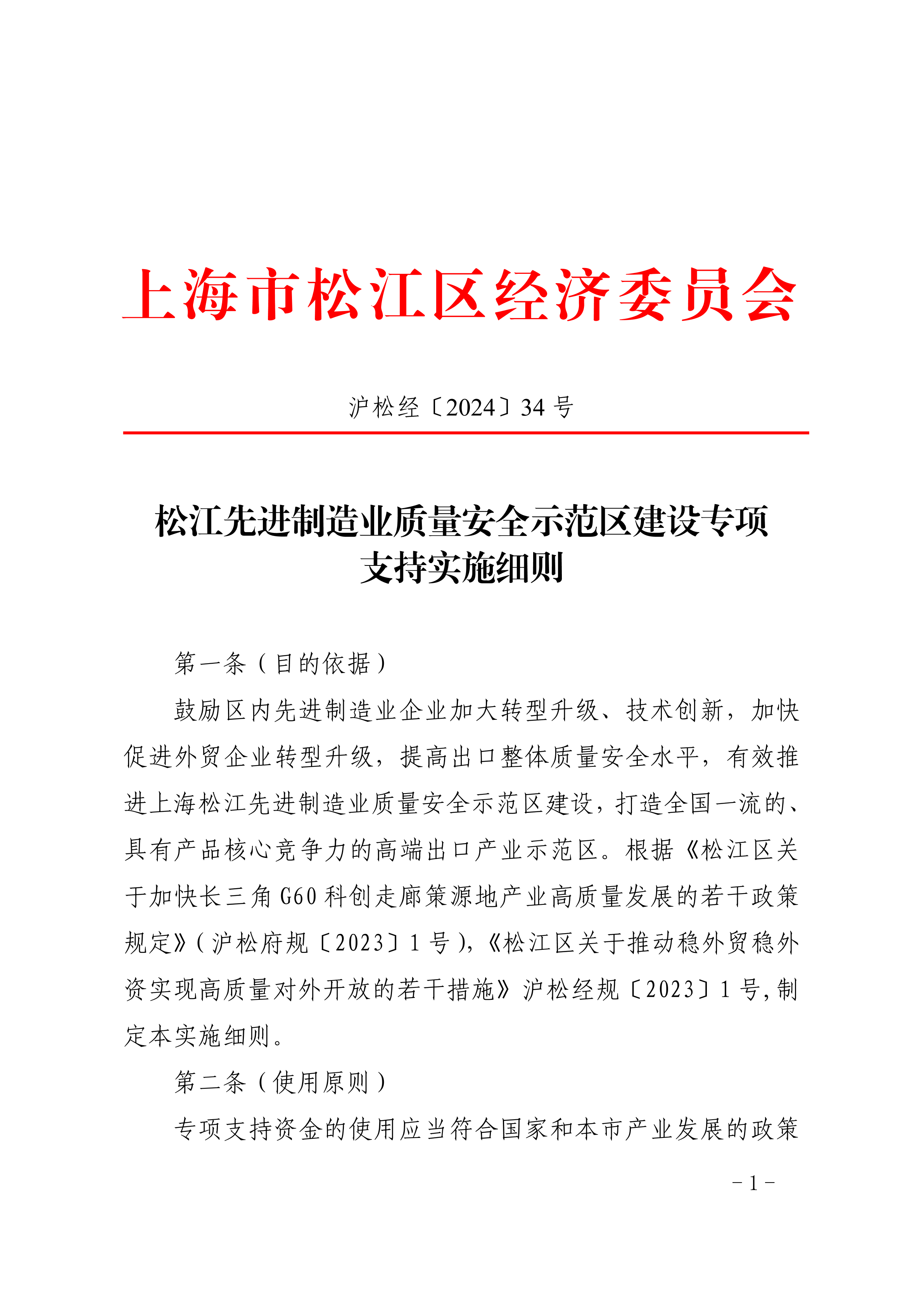 松江先进制造业质量安全示范区建设专项支持实施细则