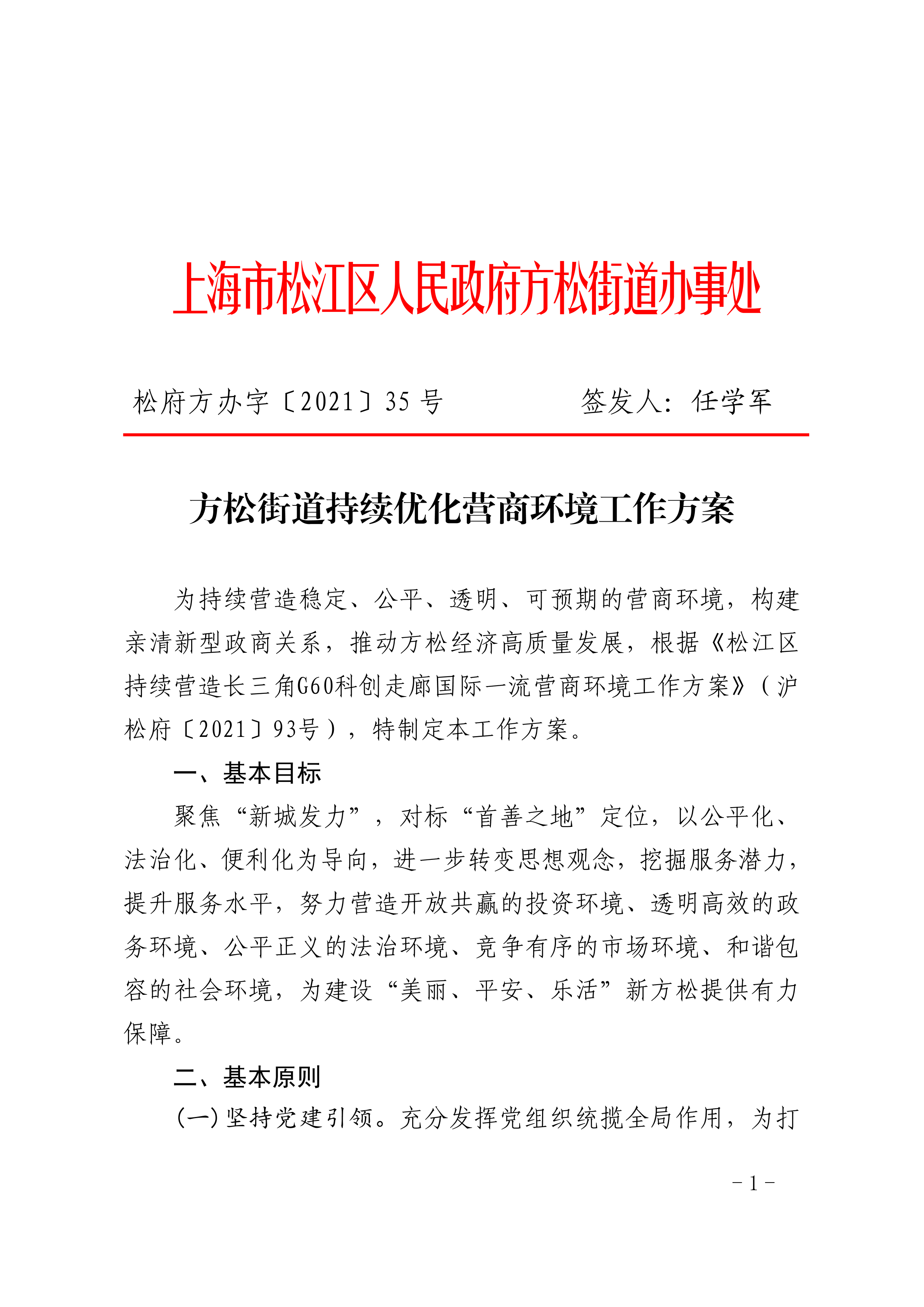 为持续营造稳定、公平、透明、可预期的营商环境,构建亲清新型政商关系,推动方松经济高质量发展,根据《松江区持续营造长三角G60科创走廊国际一流营商环境工作方案》(沪松府〔2021〕93号),特制定本工作方案。