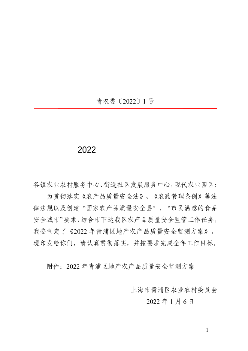 为贯彻落实《农产品质量安全法》、《农药管理条例》等法律法规以及创建“国家农产品质量安全县”、“市民满意的食品安全城市”要求,结合市下达我区农产品质量安全监管工作任务,我委制定了《2022年青浦区地产农产品质量安全监测方案》,现印发给你们,请认真贯彻落实,并按要求完成全年工作目标。