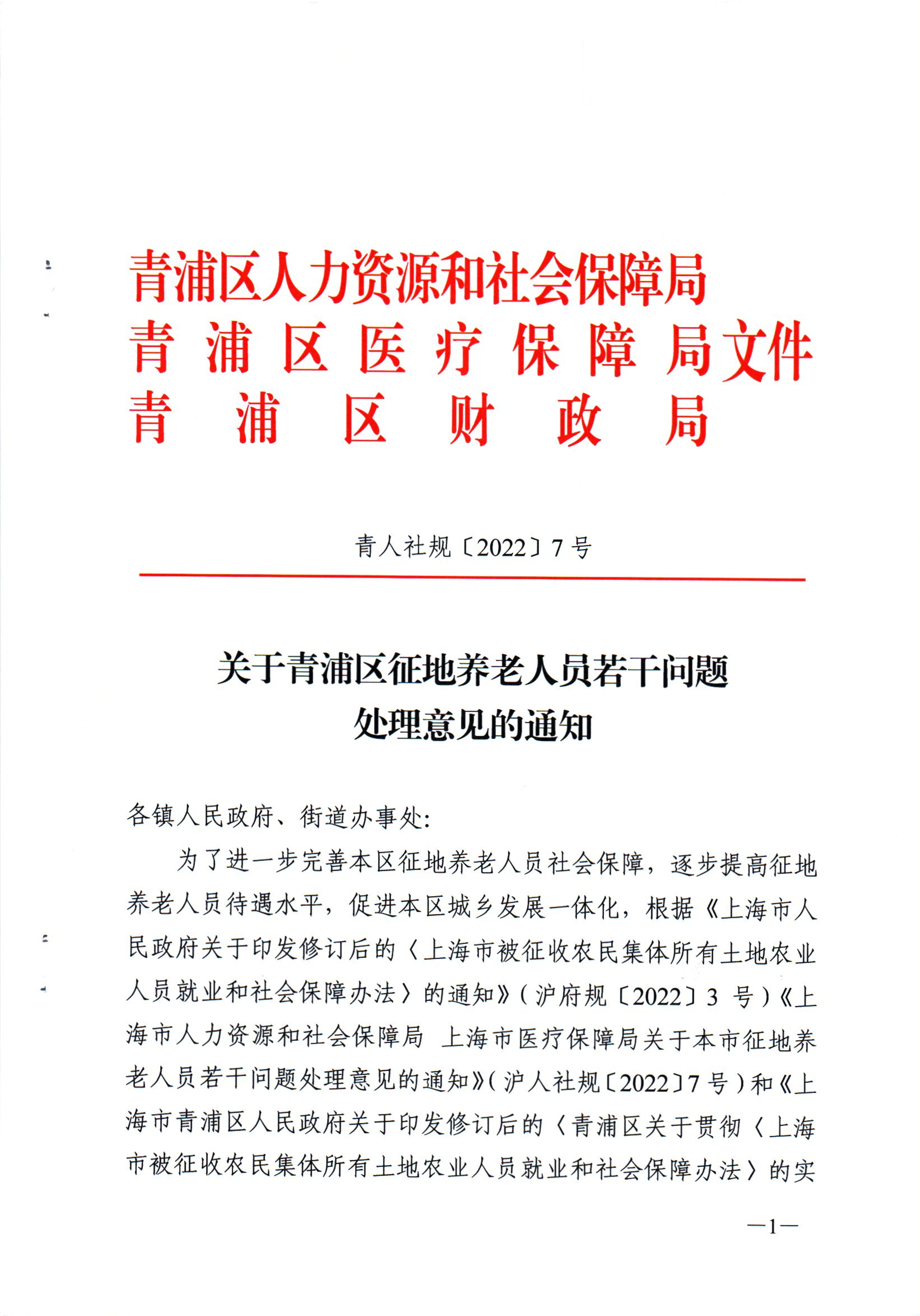 为了进一步完善本区征地养老人员社会保障,逐步提高征地养老人员待遇水平,促进本区城乡发展一体化,根据《上海市人民政府关于印发修订后的〈上海市被征收农民集体所有土地农业人员就业和社会保障办法〉的通知》(沪府规〔2022〕3号)《上海市人力资源和社会保障局上海市医疗保障局关于本市征地养老人员若干问题处理意见的通知》(沪人社规〔2022〕7号)和《上海市青浦区人民政府关于印发修订后的〈青浦区关于贯彻〈上海市被征收农民集体所有土地农业人员就业和社会保障办法〉的实施意见〉的通知》(青府规发〔2022〕3号)等有关规定,现就本区征地养老人员相关问题的处理意见通知如下: