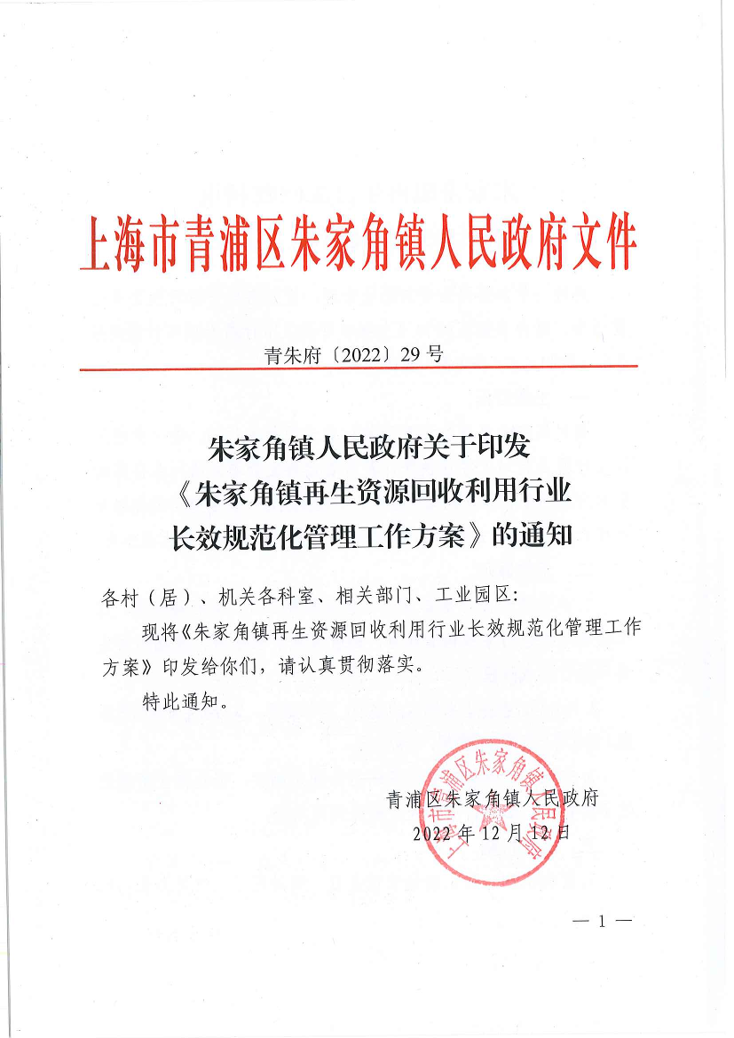 现将《朱家角镇再生资源回收利用行业长效规范化管理工作方案》印发给你们,请认真贯彻落实。