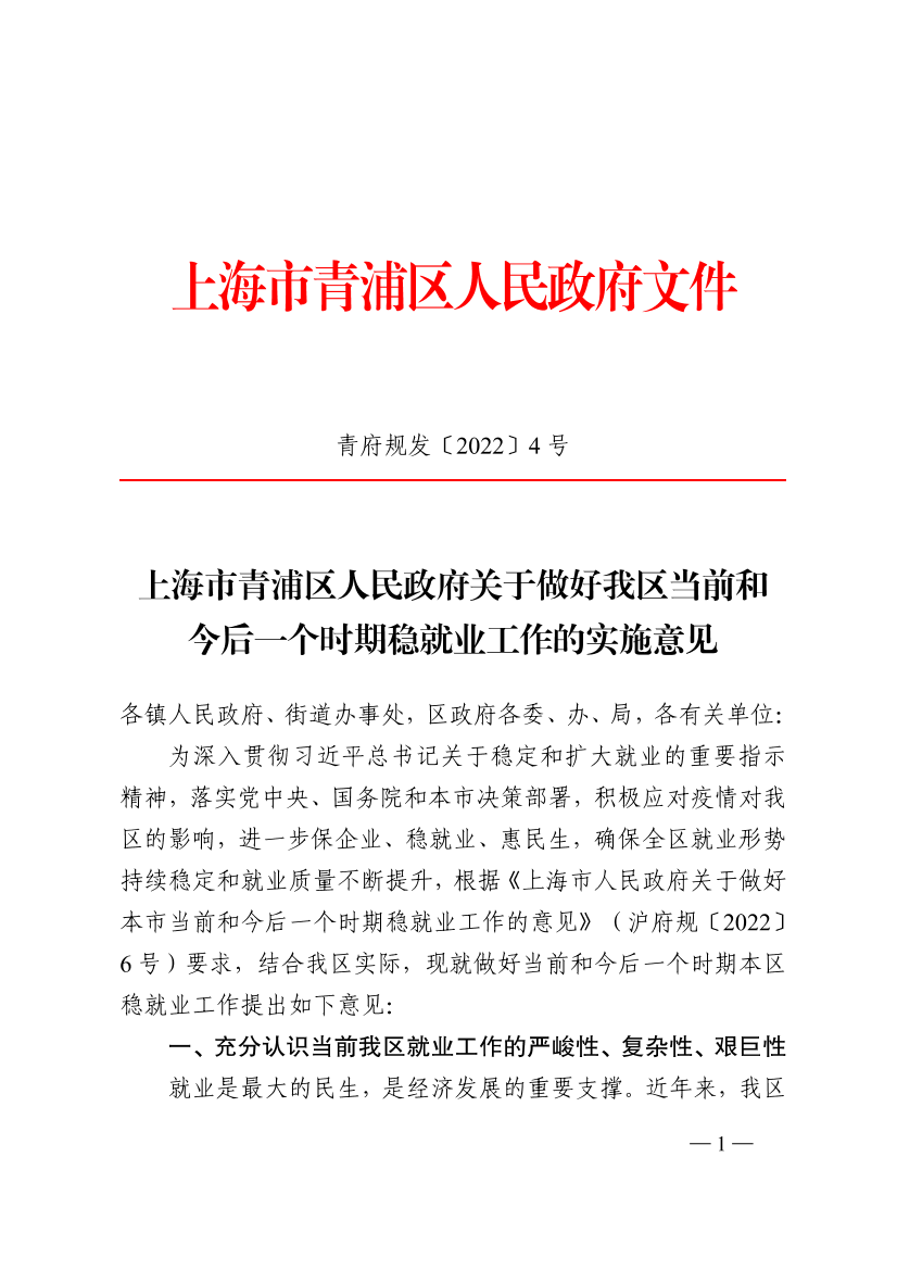 为深入贯彻习近平总书记关于稳定和扩大就业的重要指示精神,落实党中央、国务院和本市决策部署,积极应对疫情对我区的影响,进一步保企业、稳就业、惠民生,确保全区就业形势持续稳定和就业质量不断提升,根据《上海市人民政府关于做好本市当前和今后一个时期稳就业工作的意见》(沪府规〔2022〕6号)要求,结合我区实际,现就做好当前和今后一个时期本区稳就业工作提出如下意见: