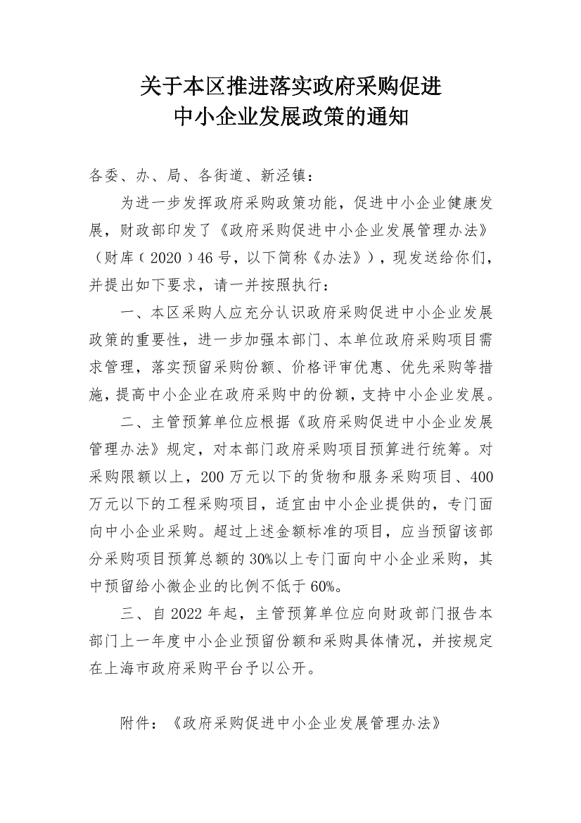为进一步发挥政府采购政策功能,促进中小企业健康发展,财政部印发了《政府采购促进中小企业发展管理办法》(财库〔2020〕46号,以下简称《办法》),现发送给你们,并提出如下要求,请一并按照执行: