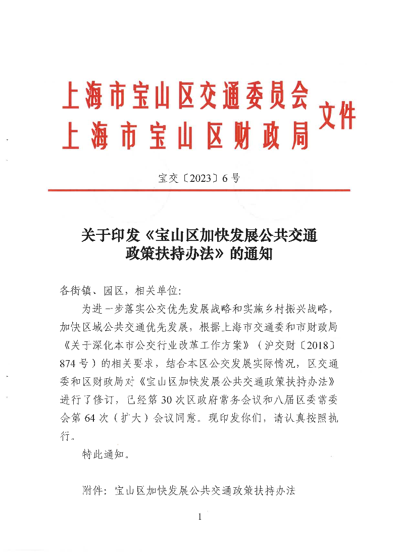 为进一步落实公交优先发展战略和实施乡村振兴战略,加快区域公共交通优先发展,根据上海市交通委和市财政局《关于深化本市公交行业改革工作方案》(沪交财〔2018〕874号)的相关要求,结合本区公交发展实际情况,区交通委和区财政局对《宝山区加快发展公共交通政策扶持办法》进行了修订,已经第30次区政府常务会议和八届区委常委会第64次(扩大)会议同意。现印发你们,请认真按照执行。