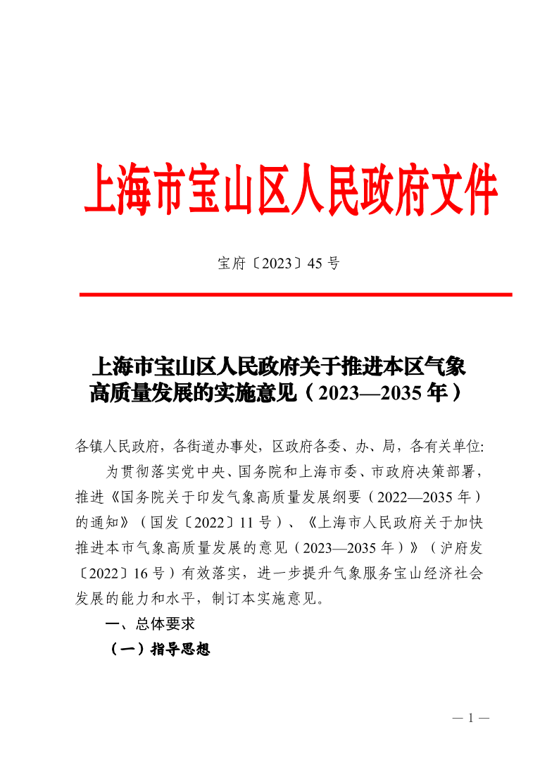 为贯彻落实党中央、国务院和上海市委、市政府决策部署,推进《国务院关于印发气象高质量发展纲要(2022—2035年)的通知》(国发〔2022〕11号)、《上海市人民政府关于加快推进本市气象高质量发展的意见(2023—2035年)》(沪府发〔2022〕16号)有效落实,进一步提升气象服务宝山经济社会发展的能力和水平,制订本实施意见。