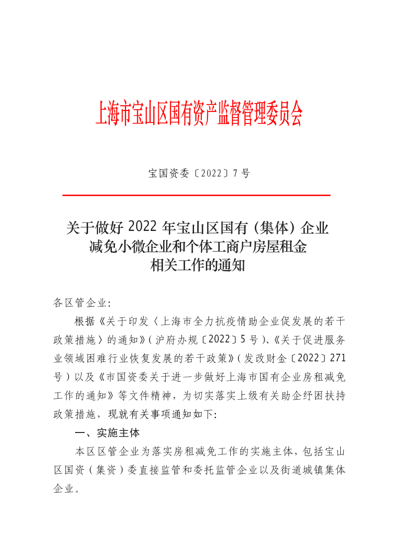 根据《关于印发〈上海市全力抗疫情助企业促发展的若干政策措施〉的通知》(沪府办规〔2022〕5号)、《关于促进服务业领域困难行业恢复发展的若干政策》(发改财金〔2022〕271号)以及《市国资委关于进一步做好上海市国有企业房租减免工作的通知》等文件精神,为切实落实上级有关助企纾困扶持政策措施,现就有关事项通知如下: