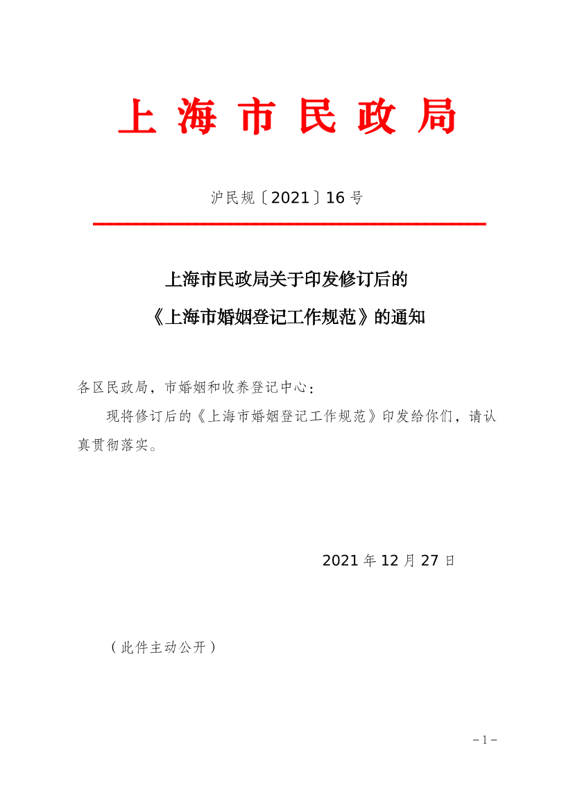 现将修订后的《上海市婚姻登记工作规范》印发给你们,请认真贯彻落实。