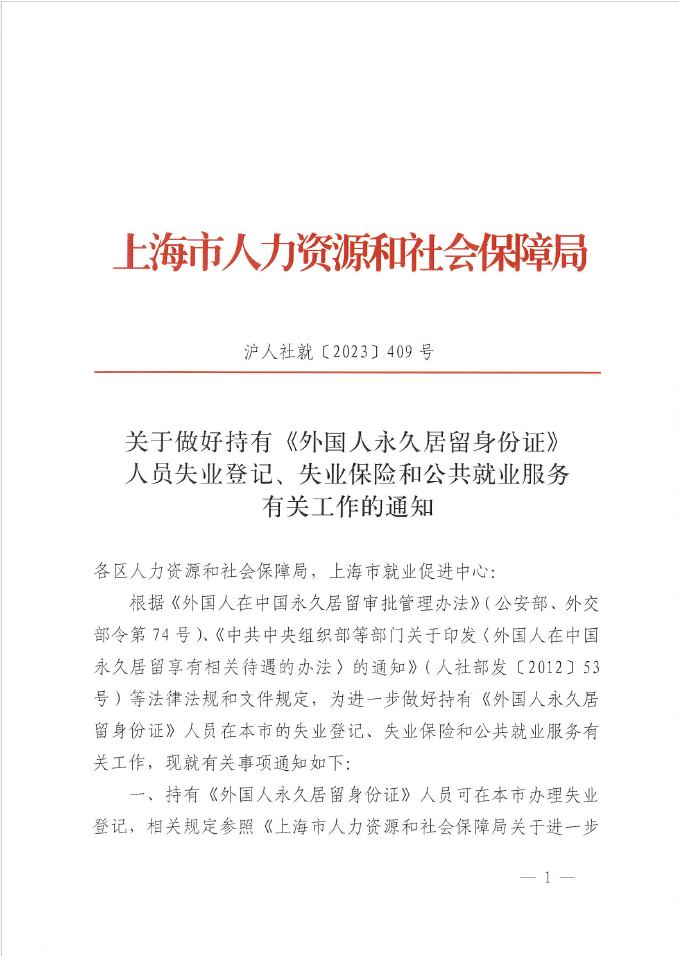 根据《外国人在中国永久居留审批管理办法》(公安部、外交部令第74号)、《中共中央组织部等部门关于印发〈外国人在中国永久居留享有相关待遇的办法〉的通知》(人社部发〔2012〕53号)等法律法规和文件规定,为进一步做好持有《外国人永久居留身份证》人员在本市的失业登记、失业保险和公共就业服务有关工作,现就有关事项通知如下: