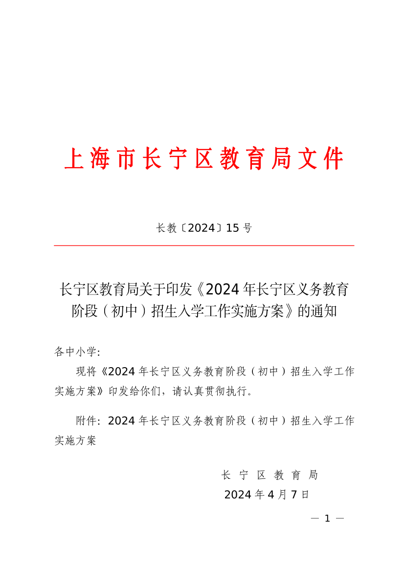 现将《2024年长宁区义务教育阶段(初中)招生入学工作实施方案》印发给你们,请认真贯彻执行。