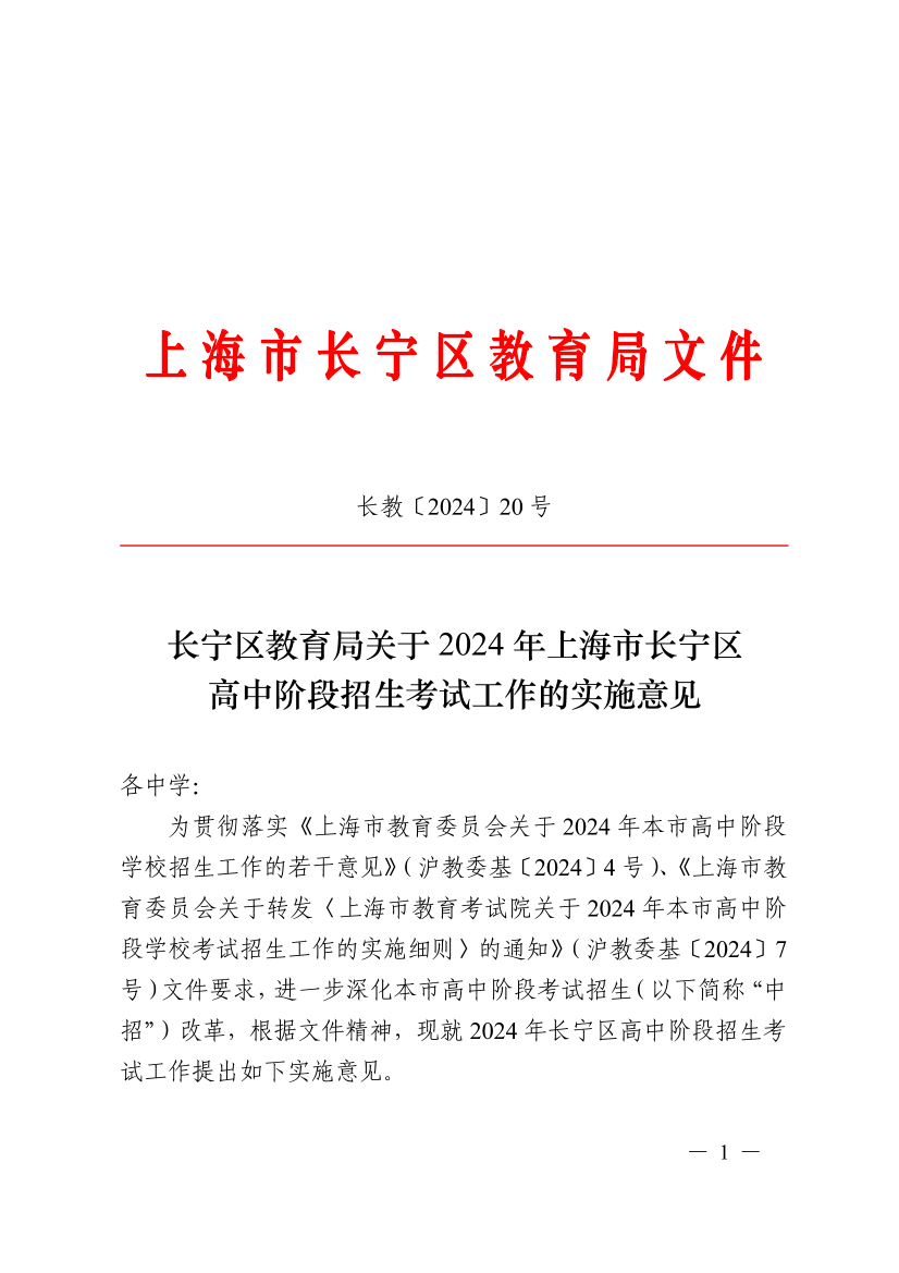 关于2024年上海市长宁区高中阶段招生考试工作的实施意见