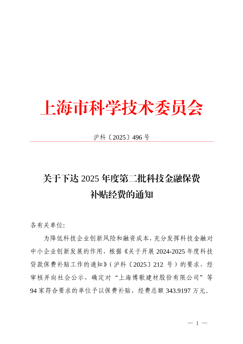 为降低科技企业创新风险和融资成本,充分发挥科技金融对中小企业创新发展的作用,根据《关于开展2024-2025年度科技贷款保费补贴工作的通知》(沪科〔2025〕212号)的要求,经审核并向社会公示,确定对“上海博歌建材股份有限公司”等94家符合要求的单位予以保费补贴,经费总额343.9197万元。